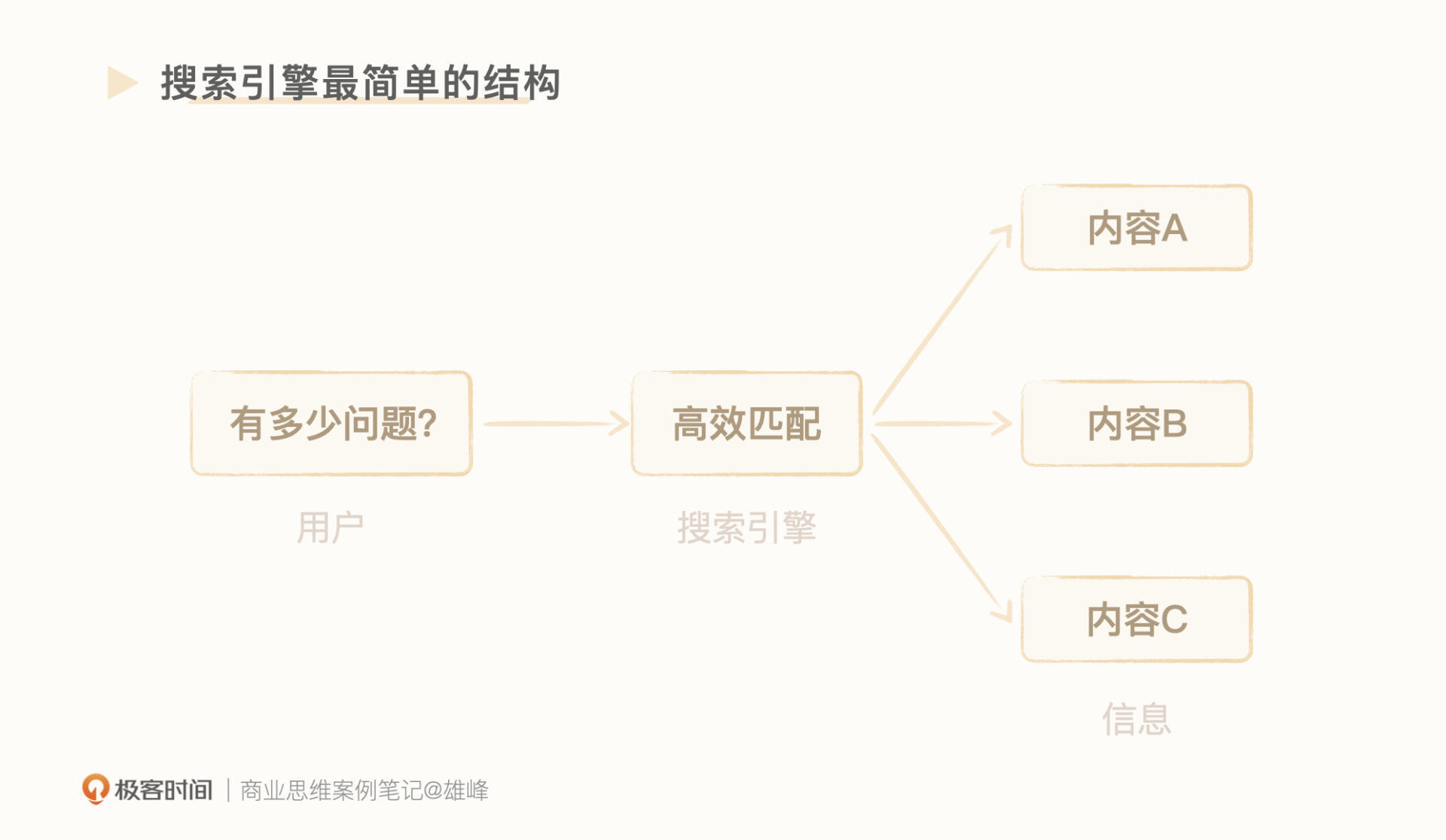 我们要怎么理解搜索引擎呢?你可以把它当成一个信息的高速公路,公路一端连接着用户的疑问,另一端连接着海量的信息。在这条高速公路上,搜索引擎会通过高效的数据算法能力,帮助用户做好信息的匹配机制。