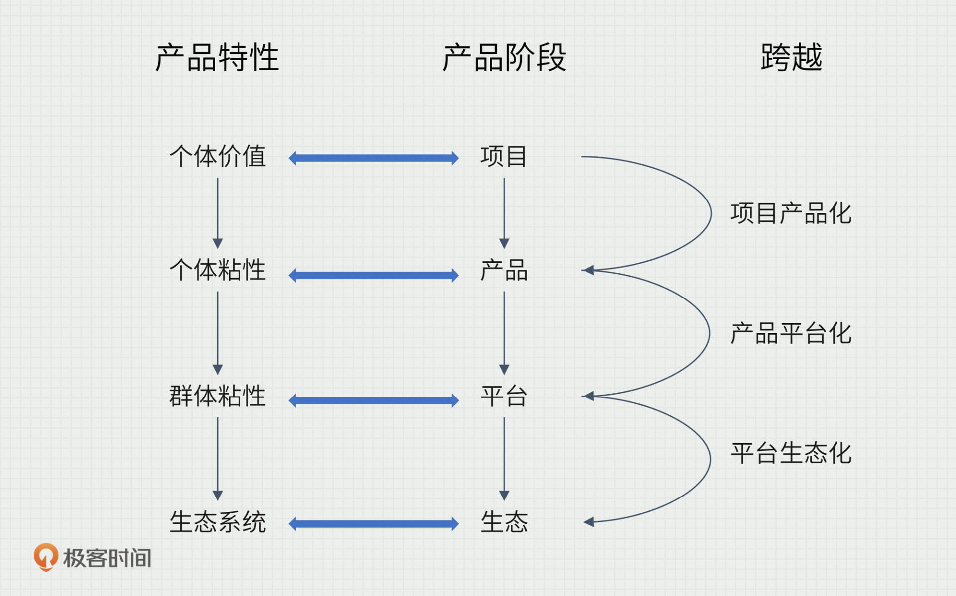 这些特性,其实就对应着项目、产品、平台、生态四个阶段,第10节的时候,我们更多在讲判断产品好坏的特征,这一节更多说每个阶段,要达到的难点、要突破的难点。而产品成长的三次跨越,也就是项目产品化,产品平台化,平台生态化。