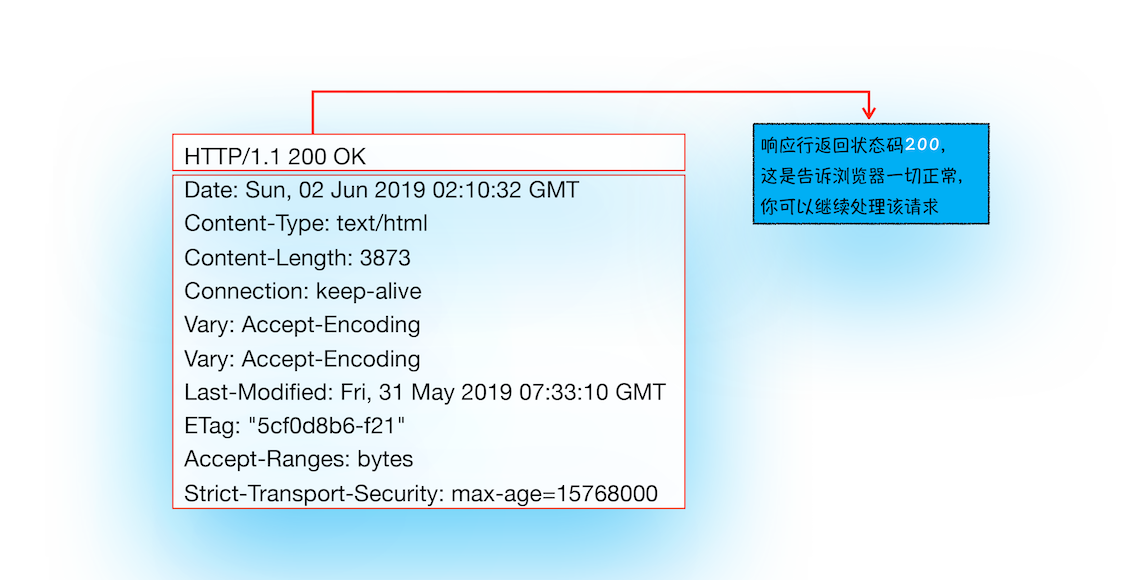 服务器接收到请求信息后,会根据请求信息生成响应数据(包括响应行、响应头和响应体等信息),并发给网络进程。等网络进程接收了响应行和响应头之后,就开始解析响应头的内容了。(为了方便讲述,下面我将服务器返回的响应头和响应行统称为响应头。)