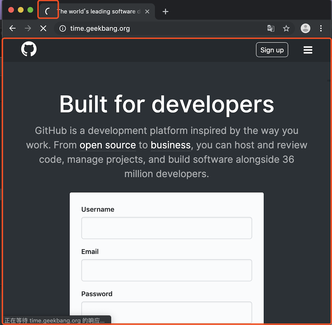 从图中可以看出,当浏览器刚开始加载一个地址之后,标签页上的图标便进入了加载状态。但此时图中页面显示的依然是之前打开的页面内容,并没立即替换为极客时间的页面。因为需要等待提交文档阶段,页面内容才会被替换。