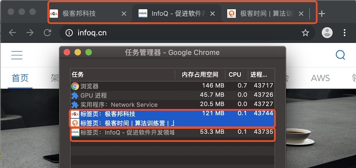 从图中任务管理器可以看出:由于极客邦和极客时间的标签页拥有相同的协议和根域名,所以它们属于同一站点,并运行在同一个渲染进程中;而infoq.cn的根域名不同于geekbang.org,也就是说InfoQ和极客邦不属于同一站点,因此它们会运行在两个不同的渲染进程之中。