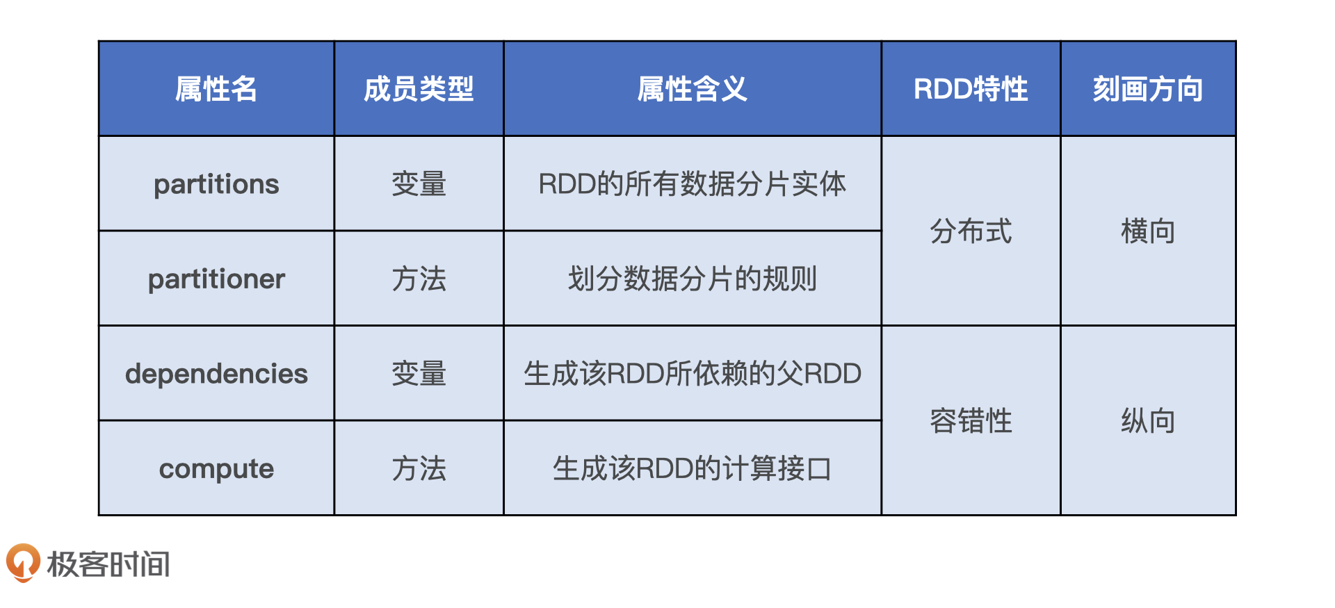 - 纵向属性dependencies和compute用于在纵深方向构建DAG,通过提供重构RDD的容错能力保障内存计算的稳定性。
