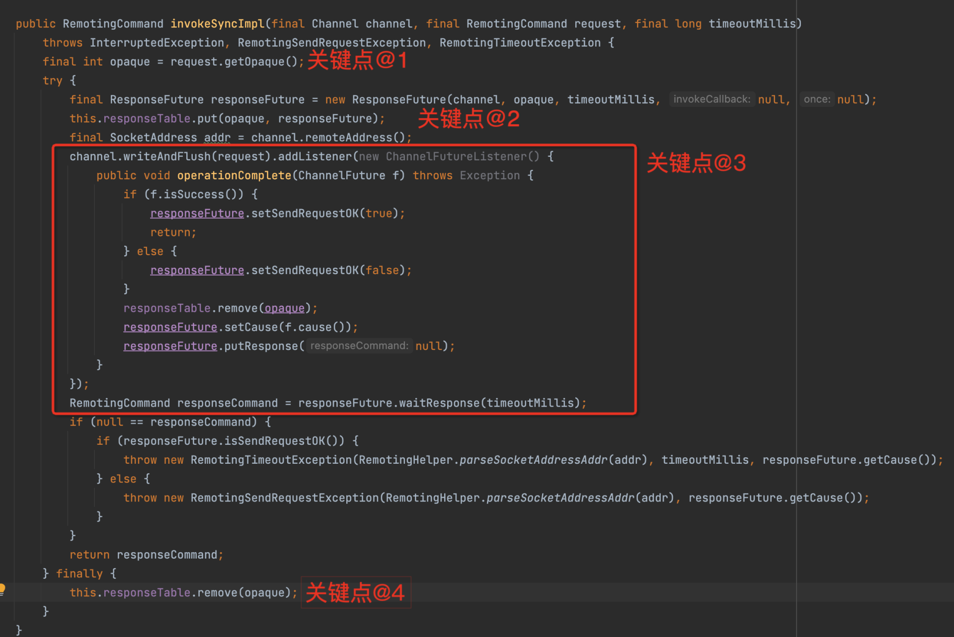 - 同步发送的实现模板,通过调用ResponseFuture获取等待结果,如果使用异步发送模式,就在第三步执行用户定义的回调函数。