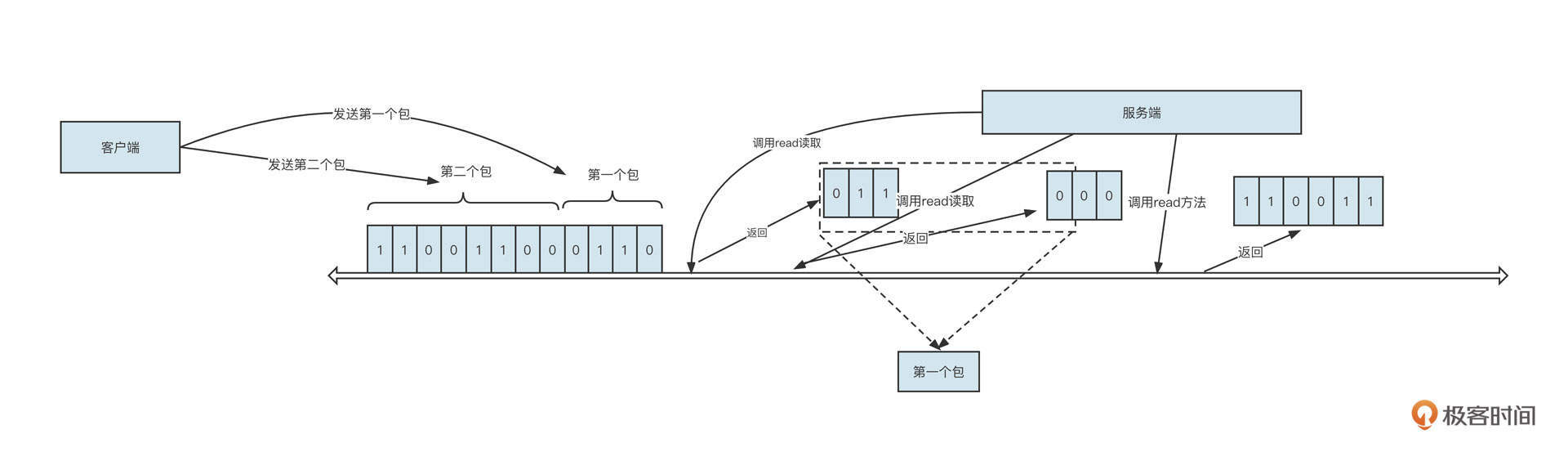 - 经过多次读取:在上面这张图中,服务端调用了3次read方法才把数据全部读取出来,分别读取到的包是011、000、110011。