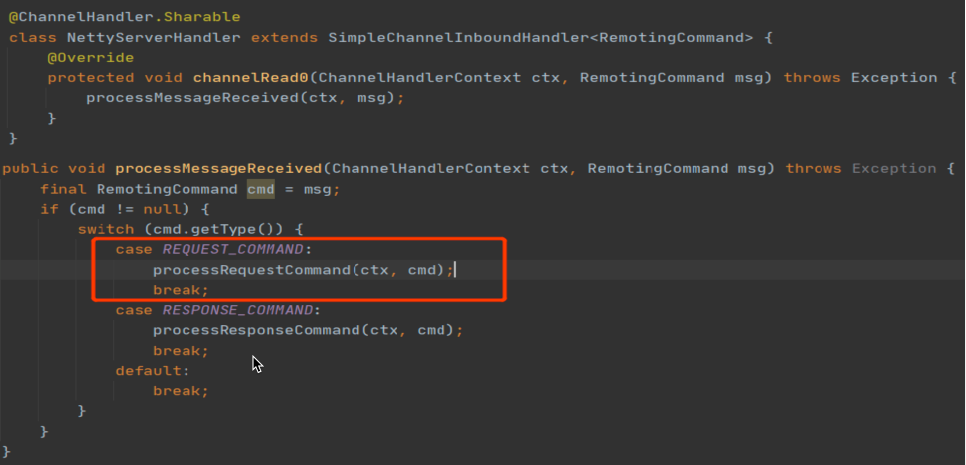 服务端处理器需要接收客户端请求,所以通常需要实现channelRead事件。通常业务Handler是在解码器之后执行,所以业务Handler中channelRead方法接收到的参数已经是通信协议中定义的具体模型,也就是请求对象了。后面就是根据该请求对象中的内容,执行对应的业务逻辑了。业务Handler会在defaultEventExecutorGroup线程组中执行,为了提高解码的性能,避免业务逻辑与IO操作相互影响,通常会将业务执行派发到业务线程池。