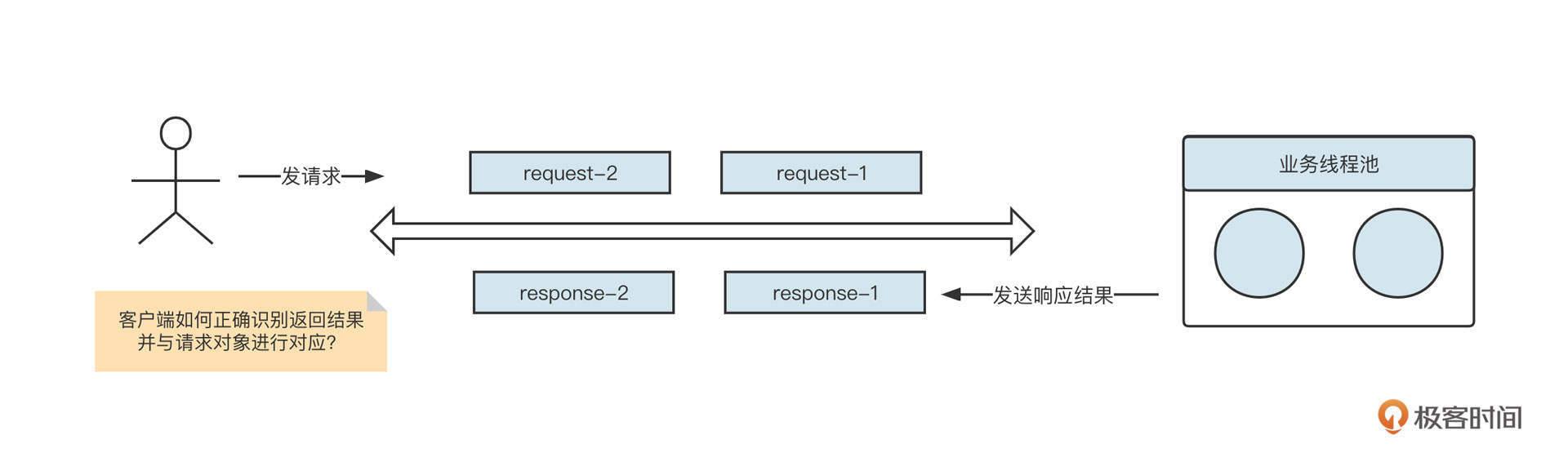- 为每一个请求创建一个唯一的请求序号。也就是为每一个请求创建一个响应结果Future,并建立RequestId到响应结果的映射Map,这样在收到服务端响应结果时,就可以准确地知道具体是哪一个请求的结果了。这是多线程共同使用单一连接发送请求的核心要点。为了更进一步理解,你可以再看一下这张示意图: