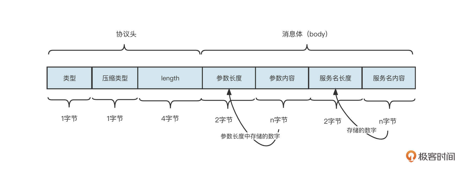为了更直观地给你展示,我直接以一个简单的 RPC 通信场景为例,实现类似Dubbo服务远程服务调用,通信协议设计如下图所示: