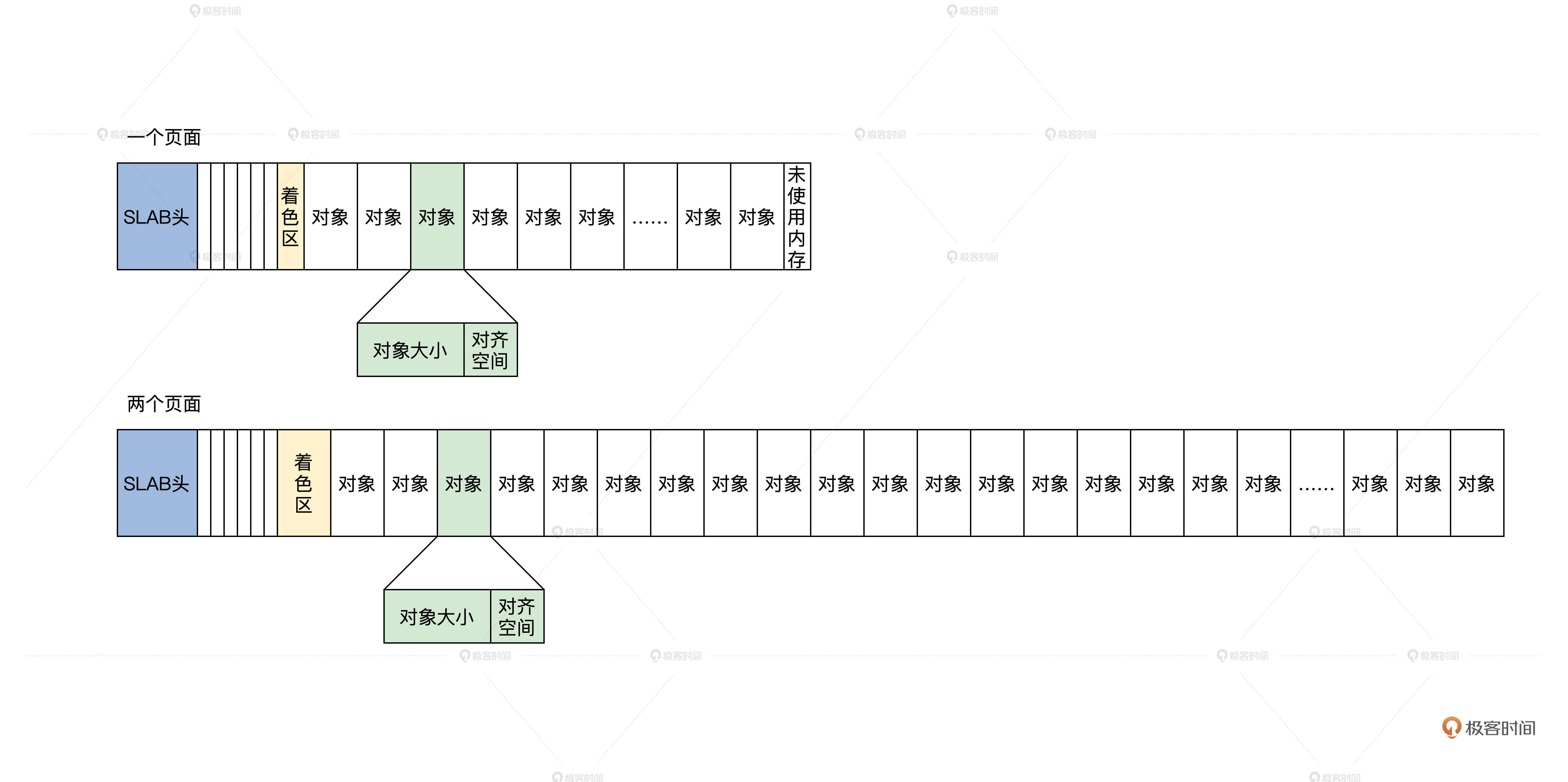 上图中有一个内存页面和两个内存页面的SLAB,你可能对着色区有点陌生,我来给你讲解一下。