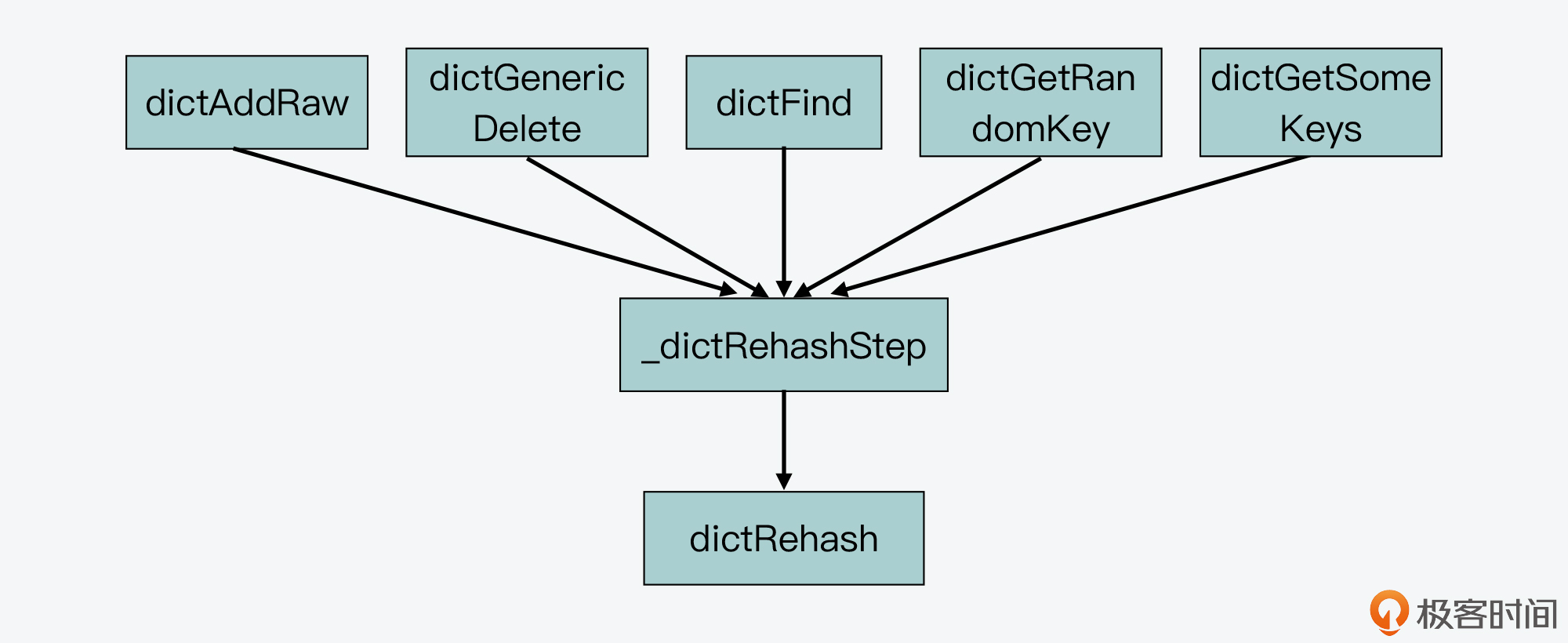 从Redis的源码中我们可以看到,一共会有5个函数通过调用_dictRehashStep函数,进而调用dictRehash函数,来执行rehash,它们分别是:dictAddRaw,dictGenericDelete,dictFind,dictGetRandomKey,dictGetSomeKeys。