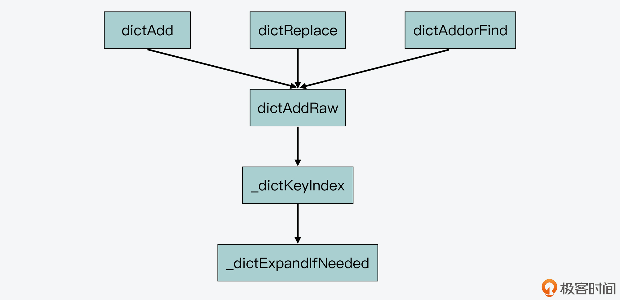 因此,当我们往Redis中写入新的键值对或是修改键值对时,Redis都会判断下是否需要进行rehash。这里你可以参考下面给出的示意图,其中就展示了_dictExpandIfNeeded被调用的关系。