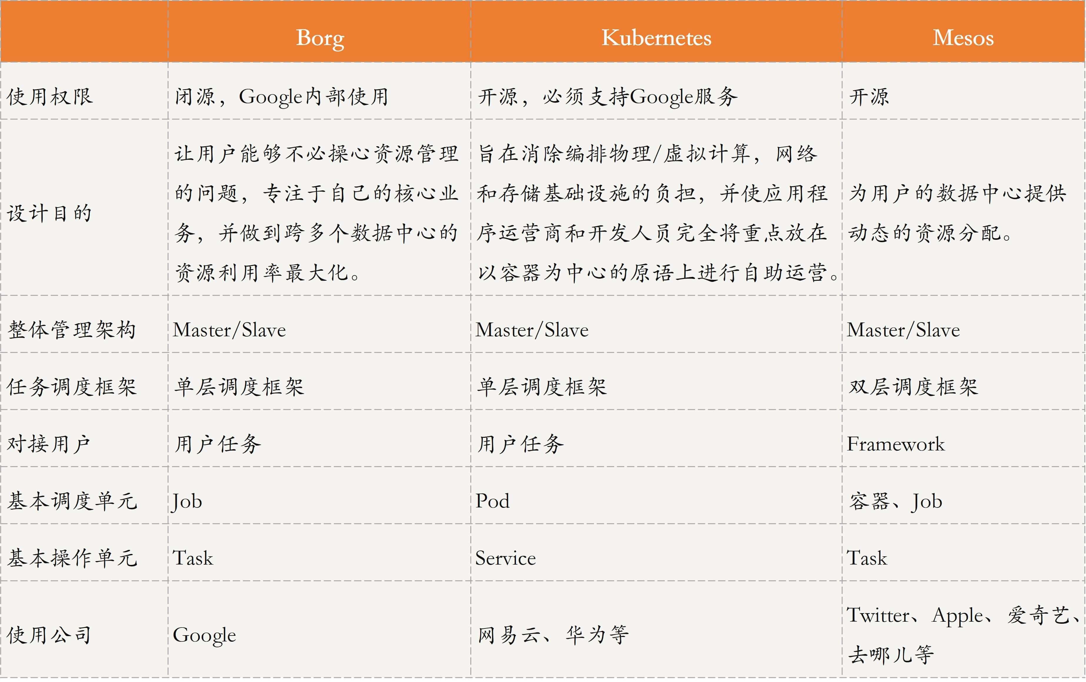 接下来,我将这3种集群管理系统的特点梳理为了一张表格,以方便你理解与记忆。