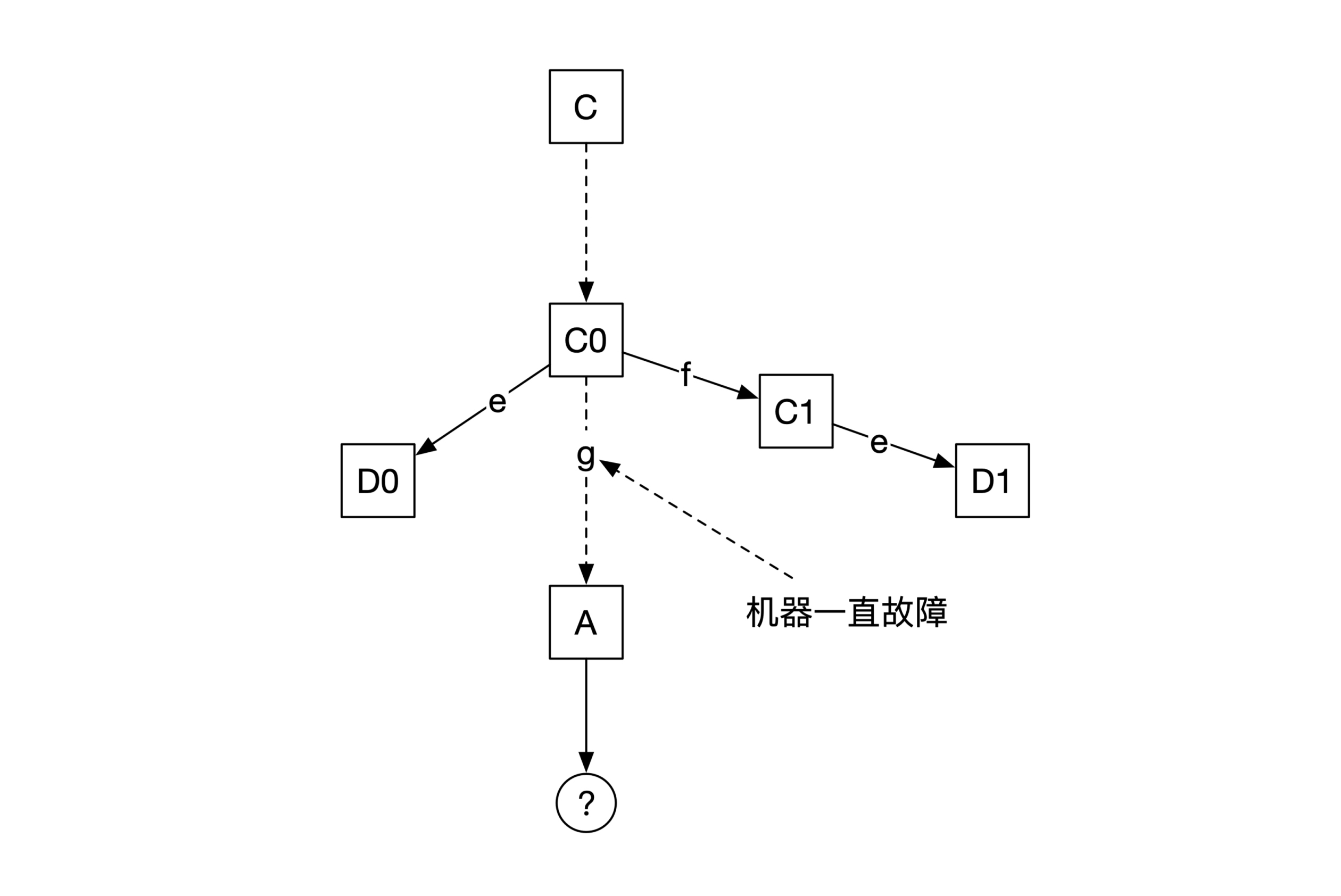 那我们再来看看**如果e和f的接收方一样,又会出现什么情况。**我们假设从状态C0开始,接收这两个消息的机器就出了故障,无法运行。系统在经过了一条路径g后,到达最终状态A,并且产生共识结果。因为无限路径和共识算法的终止性相矛盾,所以路径g的步数是有限的,。