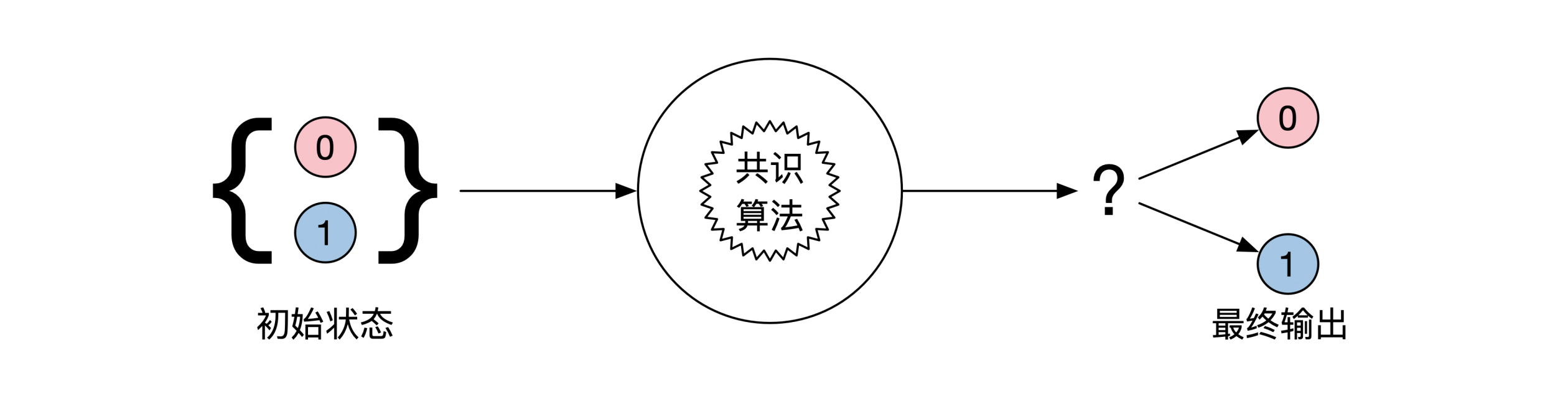 分布式系统由至少3台机器组成。每台机器都有自己的初始状态。为了方便证明,我们假设状态是二元的,即只能是0或者1。不是二元状态的情况和二元状态一样,只是证明过程会稍微繁琐一点。