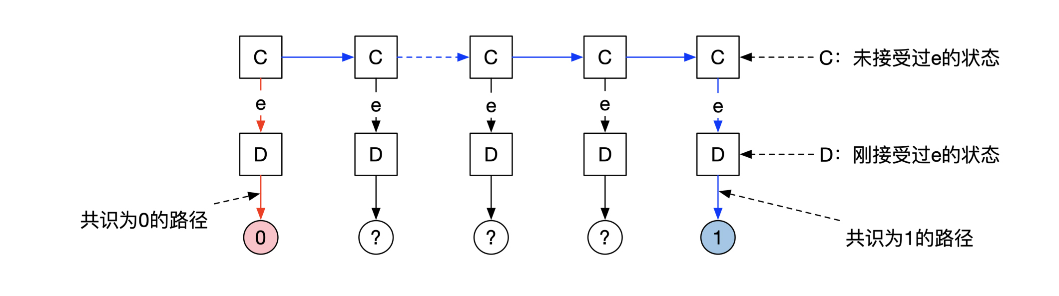 如下图所示,我们选取另一条产生共识结果为1的路径。如果这个路径不穿过集合D,那么就可以按照上面的步骤,添加消息e到路径最后面,这样这条路径一定可以穿过集合D。