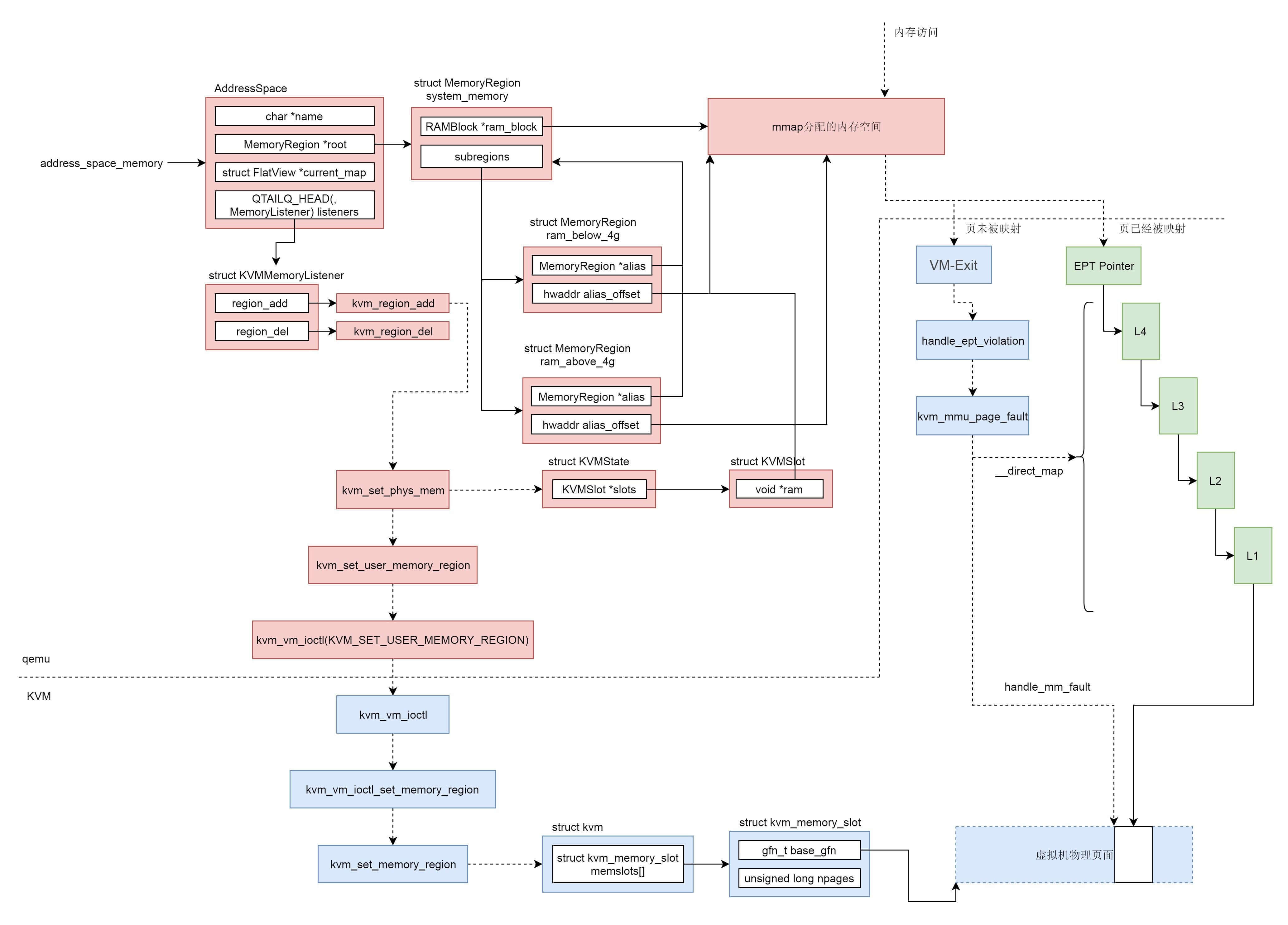 在用户态qemu中,对于虚拟机有一个结构struct KVMState表示这个虚拟机,这个结构会指向一个数组的struct KVMSlot表示这个虚拟机的多个内存条,KVMSlot中有一个void *ram指针指向mmap分配的那块虚拟内存。