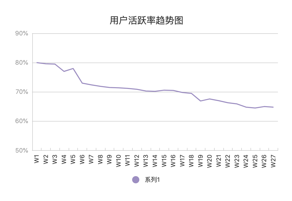 差不多过了半年时间,相关的主要功能已经基本都上线了。但通过对数据的跟进,我们发现,与试运行相比,我们的周活跃率却一直是一个下降趋势,半年的时间已经下降到了65%左右。
