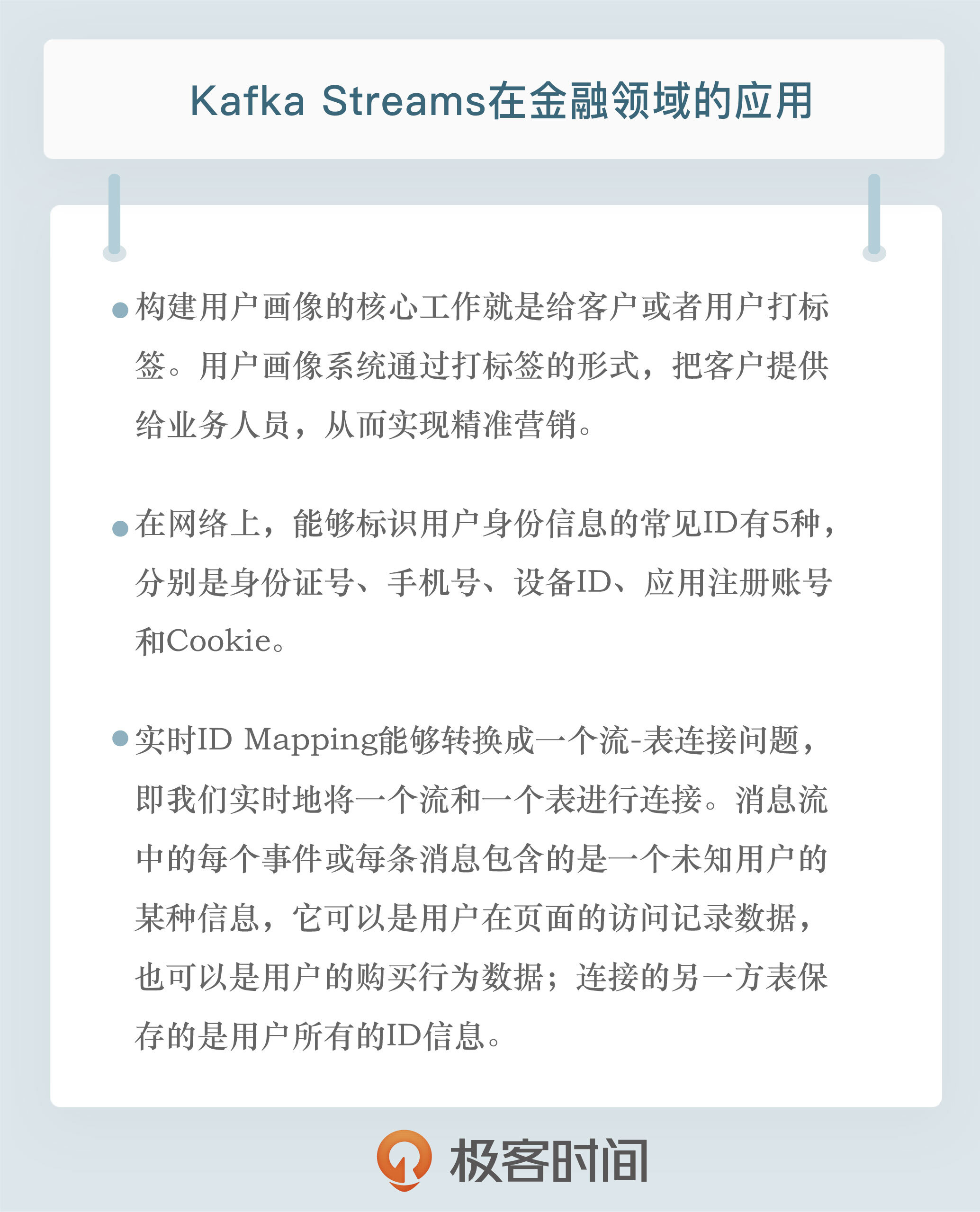 新用户在填写手机号注册App时,会向第一个主题发送一条消息,该用户后续在App上的所有访问记录,也都会以消息的形式发送到第二个主题。值得注意的是,发送到第二个主题上的消息有可能携带其他的ID信息,比如手机号或设备ID等。就像我刚刚所说的,这是一个典型的流-表实时连接场景,连接之后,我们就能够将用户的所有数据补齐,实现ID Mapping的打通。
