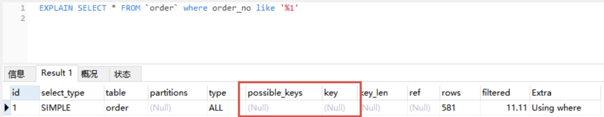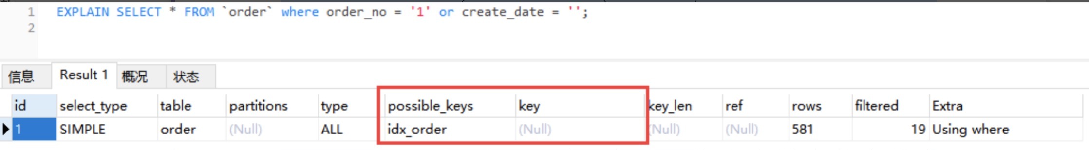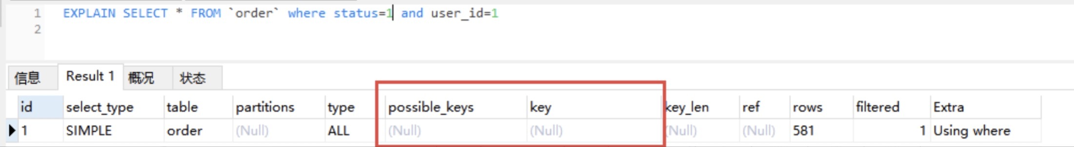 通过EXPLAIN,我们可以看到 InnoDB 存储引擎使用了idx_order索引列来统计行数,如下图所示: