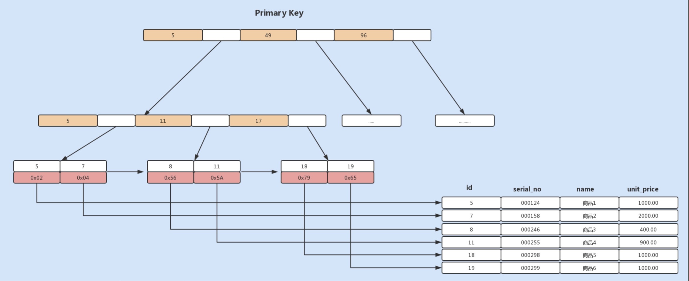基于上面的图示,如果我们需要根据商品编码查询商品,我们就需要将商品编码serial_no列作为一个索引列。此时创建的索引是一个辅助索引,与MyISAM存储引擎的主键索引的存储方式是一致的,但叶子节点存储的就不是行指针了,而是主键值,并以此来作为指向行的指针。这样的好处就是当行发生移动或者数据分裂时,不用再维护索引的变更。