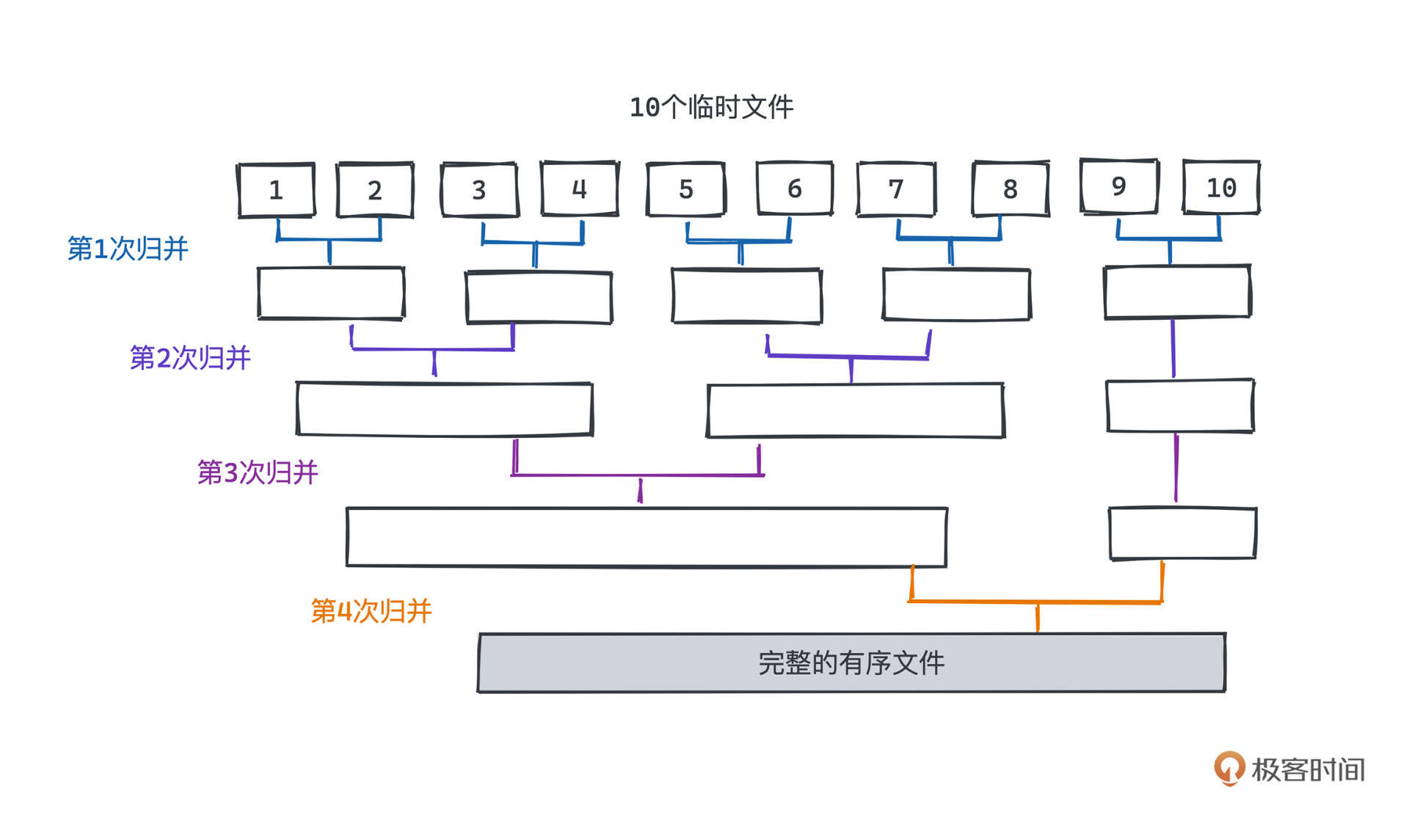 其实你会发现我们刚刚描述的想法和归并排序如出一辙,归并排序也是常用的外排实现方式,只不过我们在学习它的时候,一般都是针对数组,也就是在内存中排序的场景。