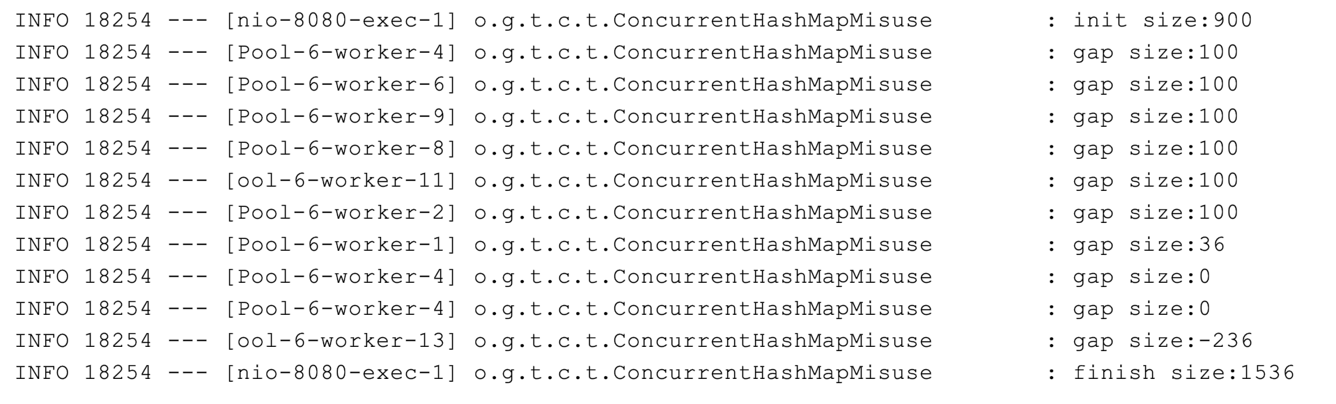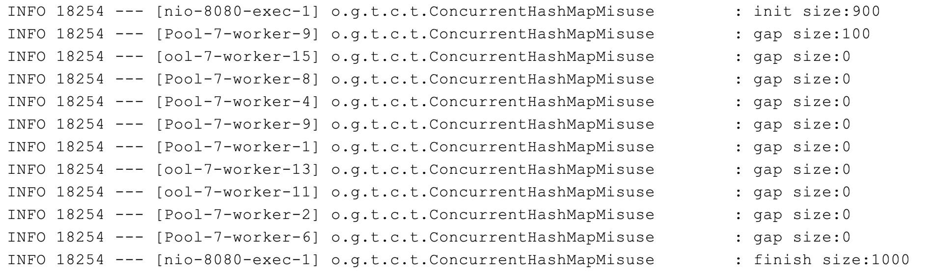 1 2 3 4 5 6 7 8 9 10 11 12 13 14 15 16 17 18 19 20 21 22 23 24 25 26 27 28 29 30 31 32 33 34 35 36 //线程个数 private static int THREAD_COUNT = 10; //总元素数量 private static int ITEM_COUNT = 1000; //帮助方法,用来获得一个指定元素数量模拟数据的ConcurrentHashMap private ConcurrentHashMap<String, Long> getData(int count) { return LongStream.rangeClosed(1, count) .boxed() .collect(Collectors.toConcurrentMap(i -> UUID.randomUUID().toString(), Function.identity(), (o1, o2) -> o1, ConcurrentHashMap::new)); } @GetMapping("wrong") public String wrong() throws InterruptedException { ConcurrentHashMap<String, Long> concurrentHashMap = getData(ITEM_COUNT - 100); //初始900个元素 log.info("init size:{}", concurrentHashMap.size()); ForkJoinPool forkJoinPool = new ForkJoinPool(THREAD_COUNT); //使用线程池并发处理逻辑 forkJoinPool.execute(() -> IntStream.rangeClosed(1, 10).parallel().forEach(i -> { //查询还需要补充多少个元素 int gap = ITEM_COUNT - concurrentHashMap.size(); log.info("gap size:{}", gap); //补充元素 concurrentHashMap.putAll(getData(gap)); })); //等待所有任务完成 forkJoinPool.shutdown(); forkJoinPool.awaitTermination(1, TimeUnit.HOURS); //最后元素个数会是1000吗? log.info("finish size:{}", concurrentHashMap.size()); return "OK"; }