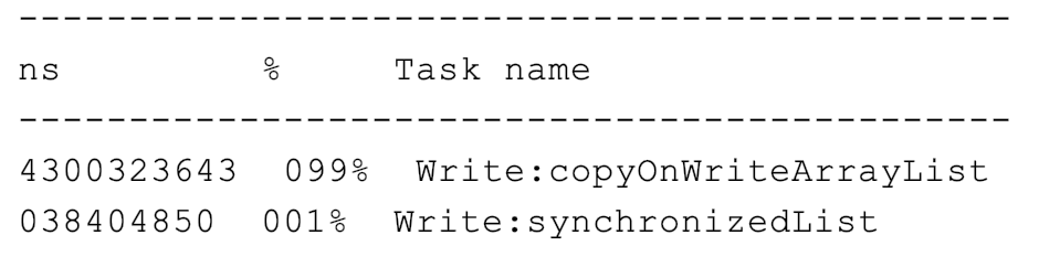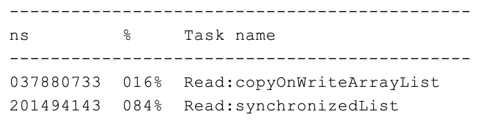 我们写一段测试代码,来比较下使用CopyOnWriteArrayList和普通加锁方式ArrayList的读写性能吧。在这段代码中我们针对并发读和并发写分别写了一个测试方法,测试两者一定次数的写或读操作的耗时。