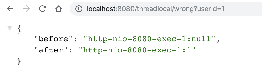 1 2 3 4 5 6 7 8 9 10 11 12 13 14 15 16 17 18 private static final ThreadLocal<Integer> currentUser = ThreadLocal.withInitial(() -> null); @GetMapping("wrong") public Map wrong(@RequestParam("userId") Integer userId) { //设置用户信息之前先查询一次ThreadLocal中的用户信息 String before = Thread.currentThread().getName() + ":" + currentUser.get(); //设置用户信息到ThreadLocal currentUser.set(userId); //设置用户信息之后再查询一次ThreadLocal中的用户信息 String after = Thread.currentThread().getName() + ":" + currentUser.get(); //汇总输出两次查询结果 Map result = new HashMap(); result.put("before", before); result.put("after", after); return result; }
