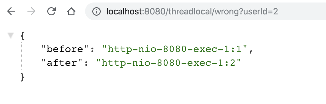 随后用户2来请求接口,这次就出现了Bug,第一和第二次获取到用户ID分别是1和2,显然第一次获取到了用户1的信息,原因就是Tomcat的线程池重用了线程。从图中可以看到,两次请求的线程都是同一个线程:http-nio-8080-exec-1。