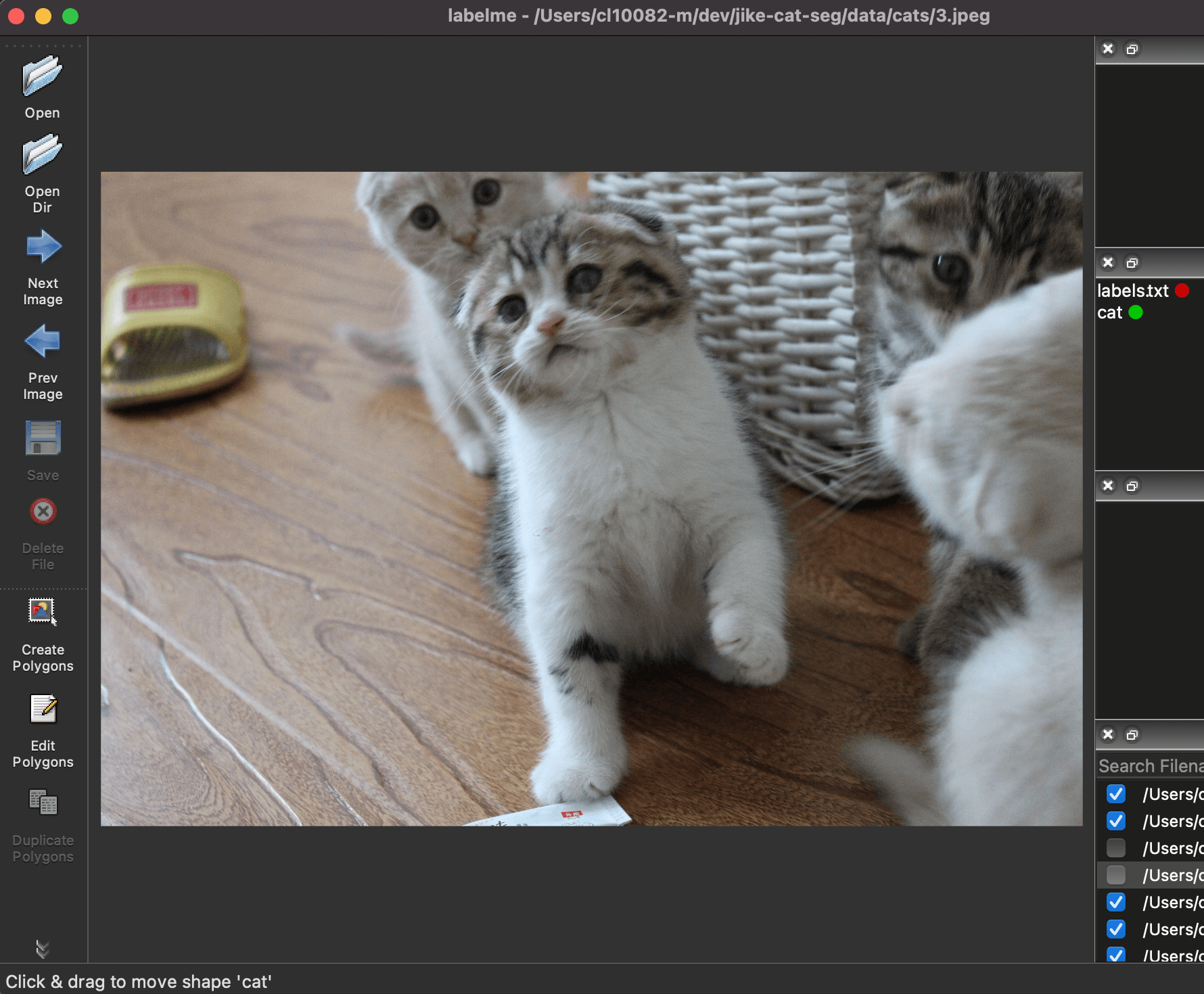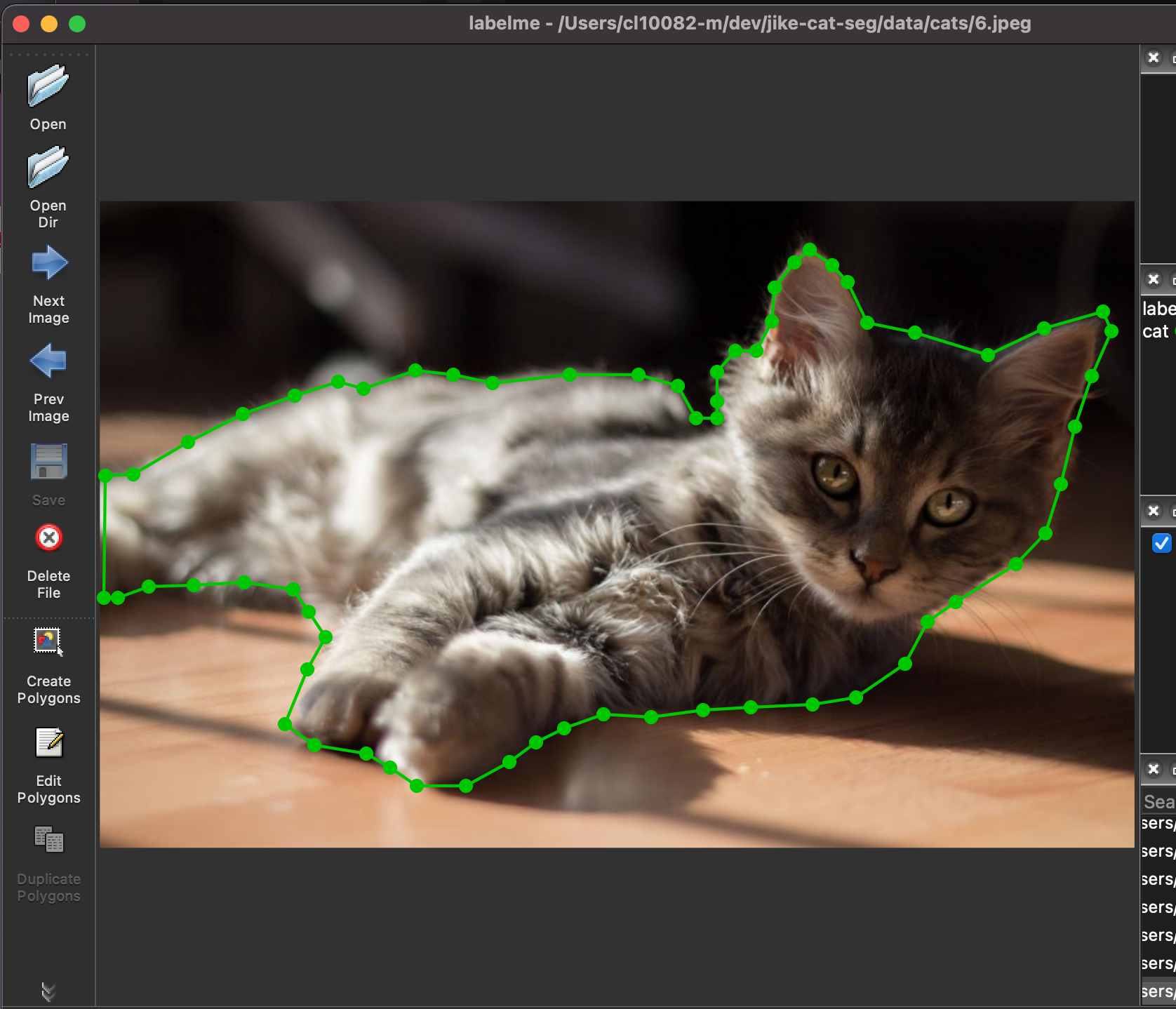 第六步:点击左侧的Create Polygons。就可以开始标注了。标记的方式就是将小猫沿着它的边界给圈出来,当形成一个闭环的时候,Labelme会自动提示你输入类别,我们选择cat类即可。