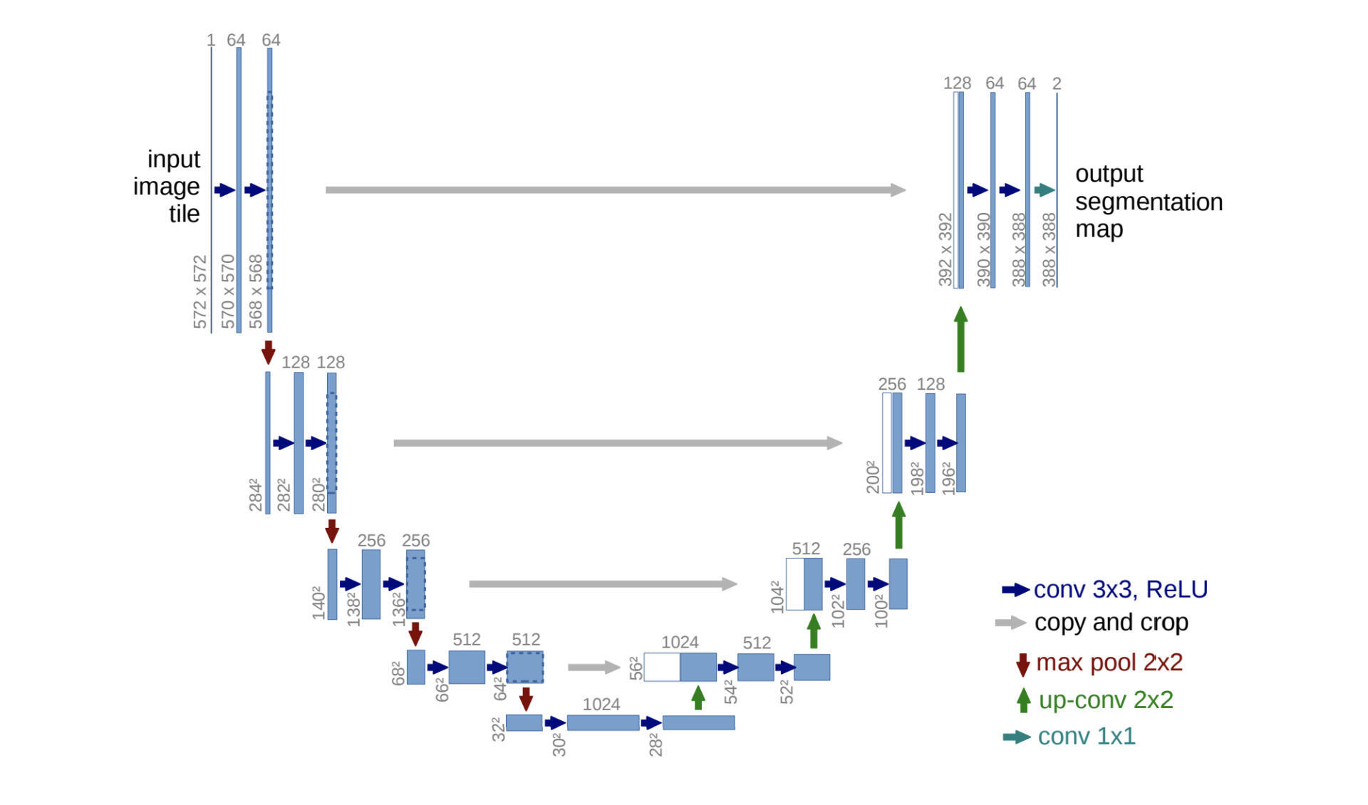 1 2 3 4 5 6 7 8 9 10 11 12 13 14 15 16 17 18 19 20 21 22 23 24 25 26 27 28 29 30 31 32 33 34 35 36 37 38 39 40 41 42 43 44 45 46 47 48 49 50 51 52 53 54 55 56 57 58 59 60 61 62 63 64 65 66 67 68 69 70 71 import torchimport torch.nn as nnclass Block (nn.Module): ... class UNet (nn.Module): def __init__ (self, in_channels=3 , out_channels=1 , init_features=32 ): super (UNet, self ).__init__() features = init_features self .conv_encoder_1 = Block(in_channels, features) self .conv_encoder_2 = Block(features, features * 2 ) self .conv_encoder_3 = Block(features * 2 , features * 4 ) self .conv_encoder_4 = Block(features * 4 , features * 8 ) self .bottleneck = Block(features * 8 , features * 16 ) self .upconv4 = nn.ConvTranspose2d( features * 16 , features * 8 , kernel_size=2 , stride=2 ) self .conv_decoder_4 = Block((features * 8 ) * 2 , features * 8 ) self .upconv3 = nn.ConvTranspose2d( features * 8 , features * 4 , kernel_size=2 , stride=2 ) self .conv_decoder_3 = Block((features * 4 ) * 2 , features * 4 ) self .upconv2 = nn.ConvTranspose2d( features * 4 , features * 2 , kernel_size=2 , stride=2 ) self .conv_decoder_2 = Block((features * 2 ) * 2 , features * 2 ) self .upconv1 = nn.ConvTranspose2d( features * 2 , features, kernel_size=2 , stride=2 ) self .decoder1 = Block(features * 2 , features) self .conv = nn.Conv2d( in_channels=features, out_channels=out_channels, kernel_size=1 ) def forward (self, x ): conv_encoder_1_1 = self .conv_encoder_1(x) conv_encoder_1_2 = nn.MaxPool2d(kernel_size=2 , stride=2 )(conv_encoder_1_1) conv_encoder_2_1 = self .conv_encoder_2(conv_encoder_1_2) conv_encoder_2_2 = nn.MaxPool2d(kernel_size=2 , stride=2 )(conv_encoder_2_1) conv_encoder_3_1 = self .conv_encoder_3(conv_encoder_2_2) conv_encoder_3_2 = nn.MaxPool2d(kernel_size=2 , stride=2 )(conv_encoder_3_1) conv_encoder_4_1 = self .conv_encoder_4(conv_encoder_3_2) conv_encoder_4_2 = nn.MaxPool2d(kernel_size=2 , stride=2 )(conv_encoder_4_1) bottleneck = self .bottleneck(conv_encoder_4_2) conv_decoder_4_1 = self .upconv4(bottleneck) conv_decoder_4_2 = torch.cat((conv_decoder_4_1, conv_encoder_4_1), dim=1 ) conv_decoder_4_3 = self .conv_decoder_4(conv_decoder_4_2) conv_decoder_3_1 = self .upconv3(conv_decoder_4_3) conv_decoder_3_2 = torch.cat((conv_decoder_3_1, conv_encoder_3_1), dim=1 ) conv_decoder_3_3 = self .conv_decoder_3(conv_decoder_3_2) conv_decoder_2_1 = self .upconv2(conv_decoder_3_3) conv_decoder_2_2 = torch.cat((conv_decoder_2_1, conv_encoder_2_1), dim=1 ) conv_decoder_2_3 = self .conv_decoder_2(conv_decoder_2_2) conv_decoder_1_1 = self .upconv1(conv_decoder_2_3) conv_decoder_1_2 = torch.cat((conv_decoder_1_1, conv_encoder_1_1), dim=1 ) conv_decoder_1_3 = self .decoder1(conv_decoder_1_2) return torch.sigmoid(self .conv(conv_decoder_1_3))