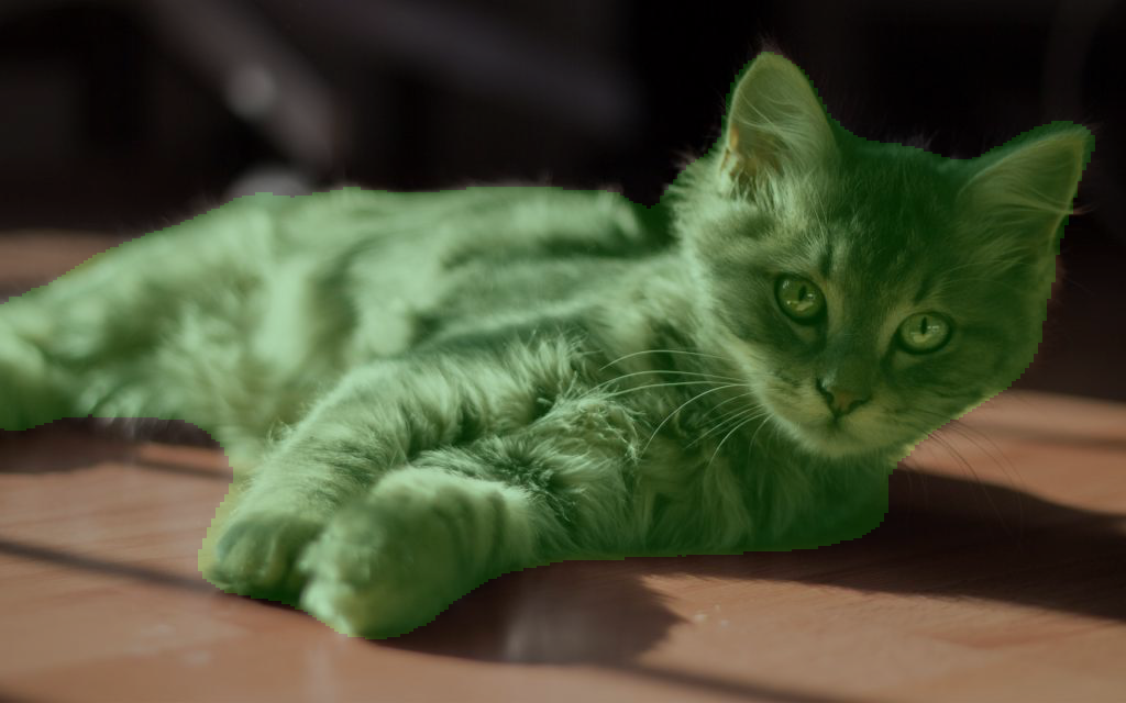 其中,putpalette函数的参数是一个列表:[0, 0, 0, 0, 128, 0],列表前三个数表示值为0的像素的RGB([0, 0, 0]表示黑色),列表后三个数表示值为1的像素的RGB([0, 128, 0]表示绿色)。这样,我们保存的Mask图片,黑色部分即为背景区域,绿色部分即为猫的区域。