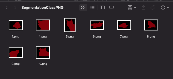 其中,cats为标记好的数据,cats_output为输出文件夹。在cats_output下会自动生成4个文件夹,我们只需要两个文件夹,分别是JPEGImages(训练原图)与SegmentationClassPNG(转换后的Mask)。