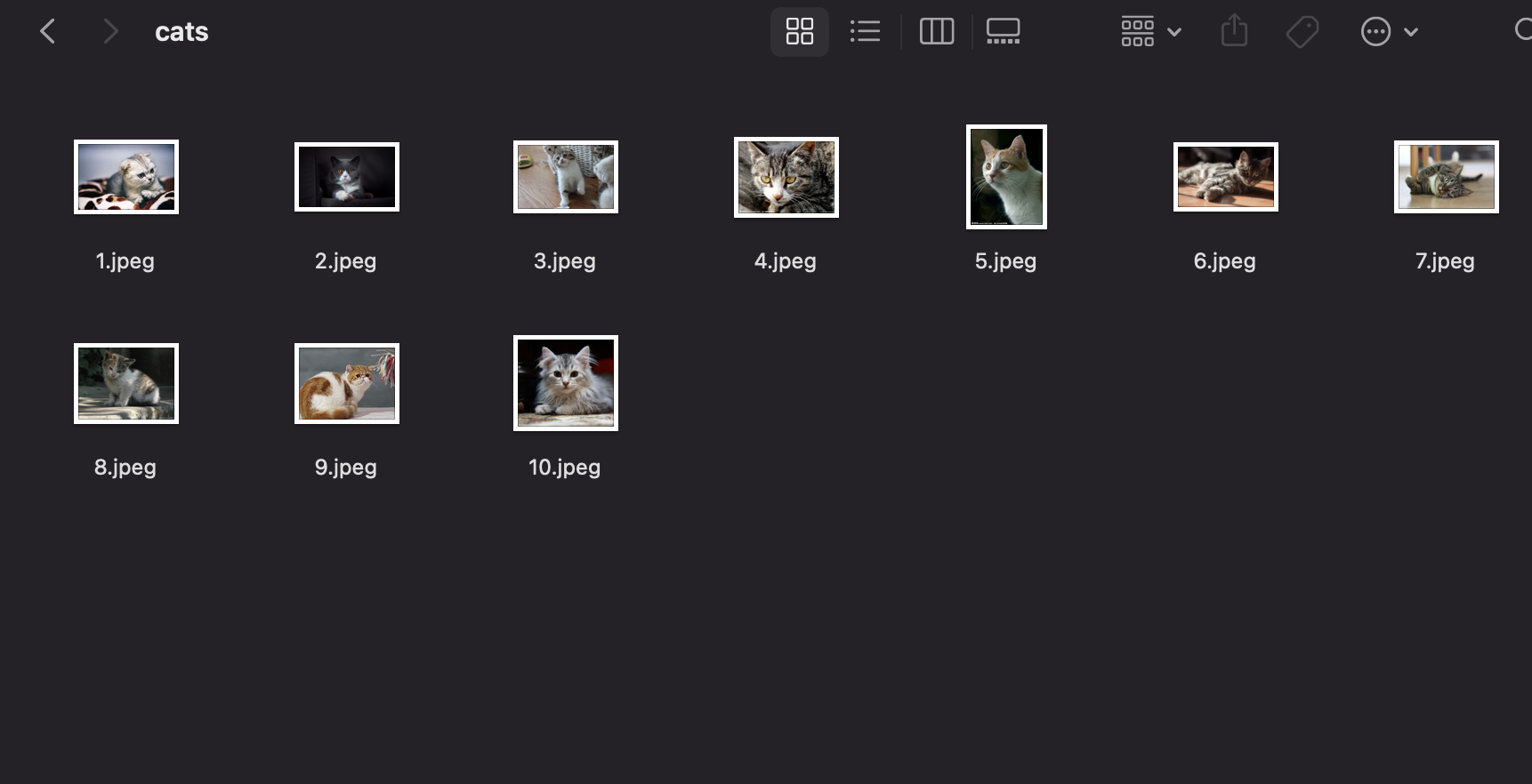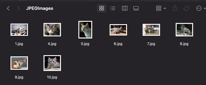 1 2 fangyuan@geektime data $ ls cats 1.j peg 1.j son 10.j peg 10.j son 2.j peg 3.j peg 4.j peg 4.j son