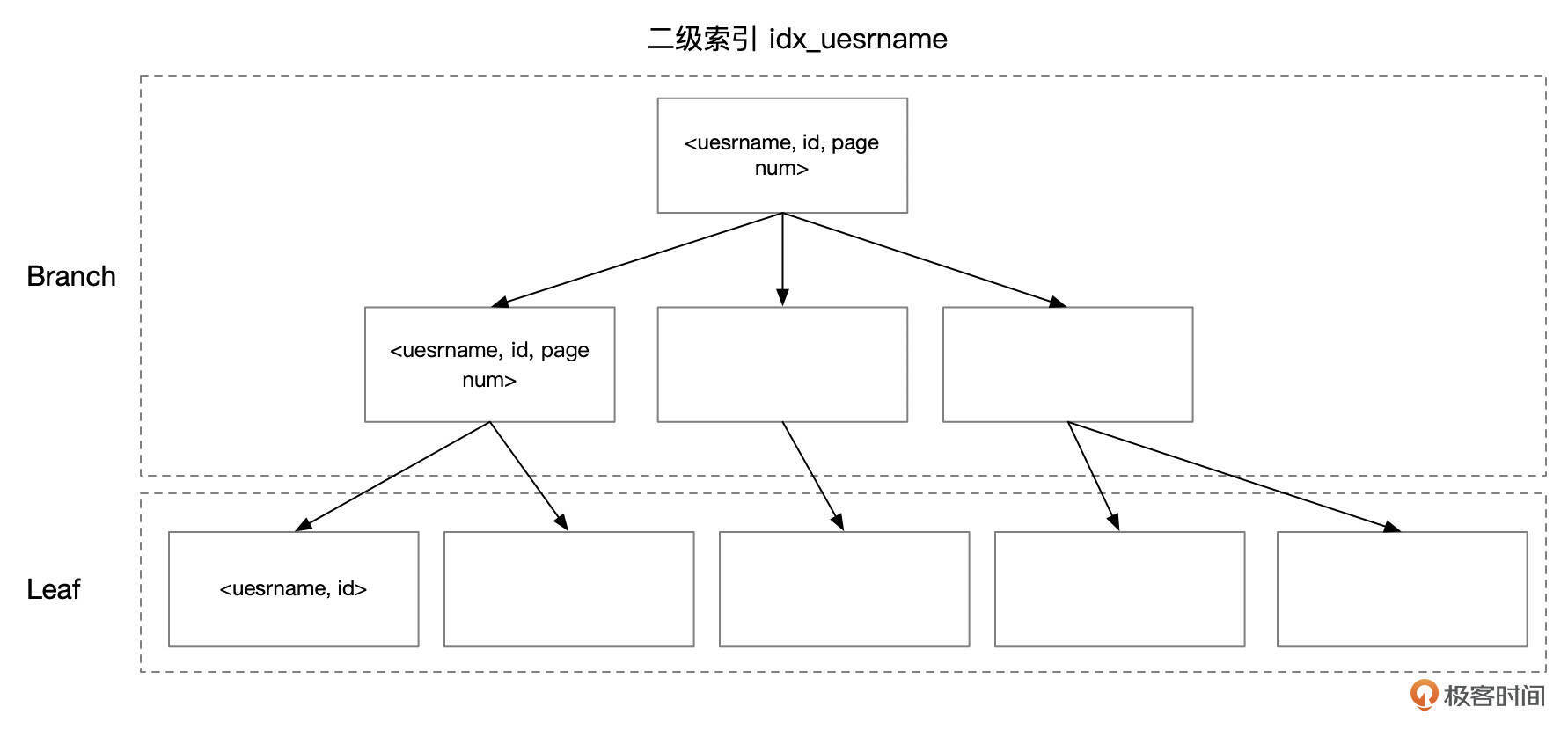 下面是索引idx_username的一个示意图,分支页面中,索引条目为 (username, id, page num),叶子页面中,索引条目为 (username, id)。
