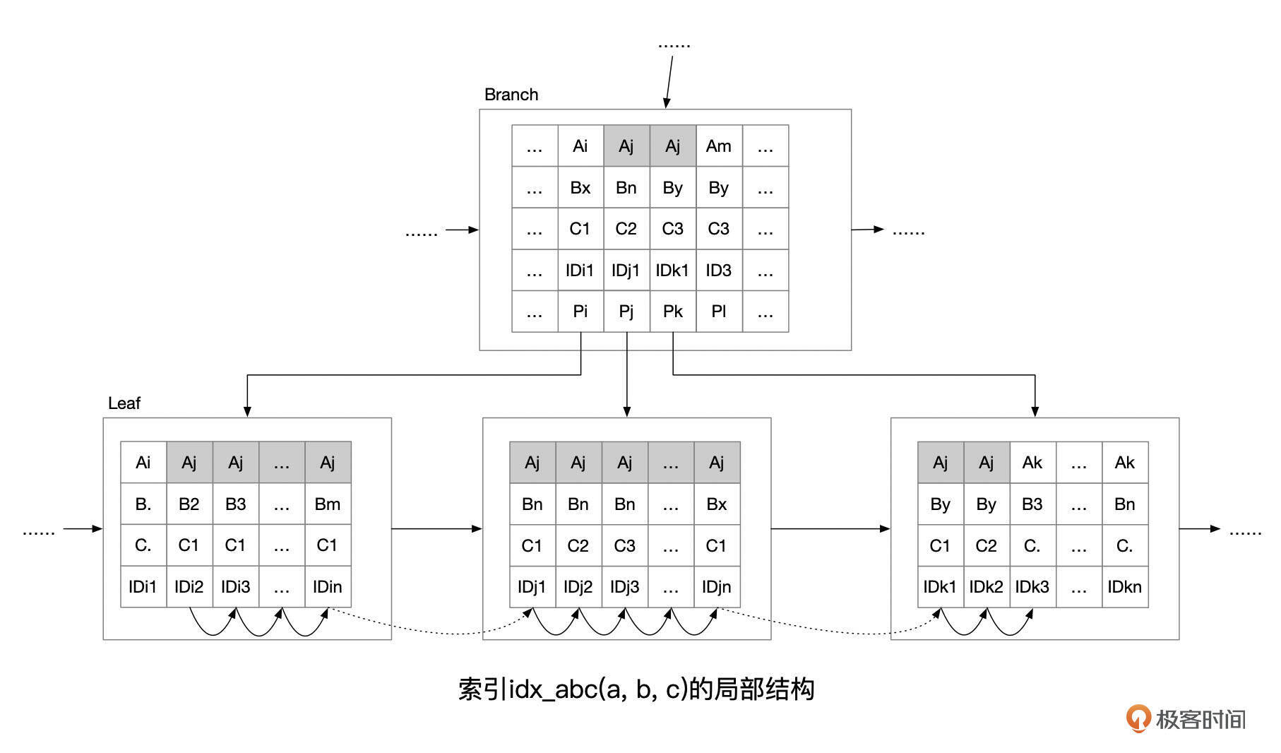 组合索引的结构实际上和单列索引是一样的,只不过索引条目由更多的字段组成。我们来看一下组合索引idx_abc局部结构的示意图。
