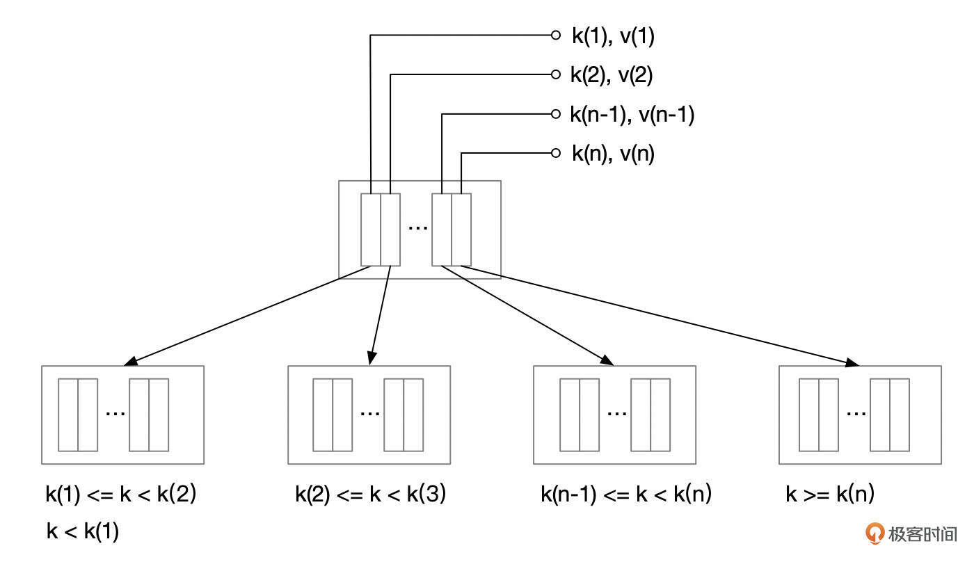 索引页面内的n条记录(k1, v1),(k2, v2),…(kn, vn),将Key的取值划分为n+1个区间。