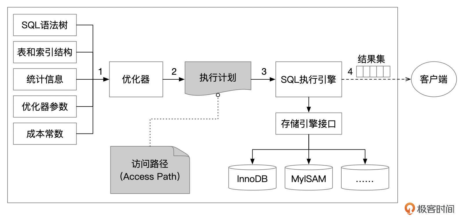 - SQL执行引擎根据执行计划,按一定的步骤,调用存储引擎接口获取数据,执行表连接、排序等操作,生成结果集。