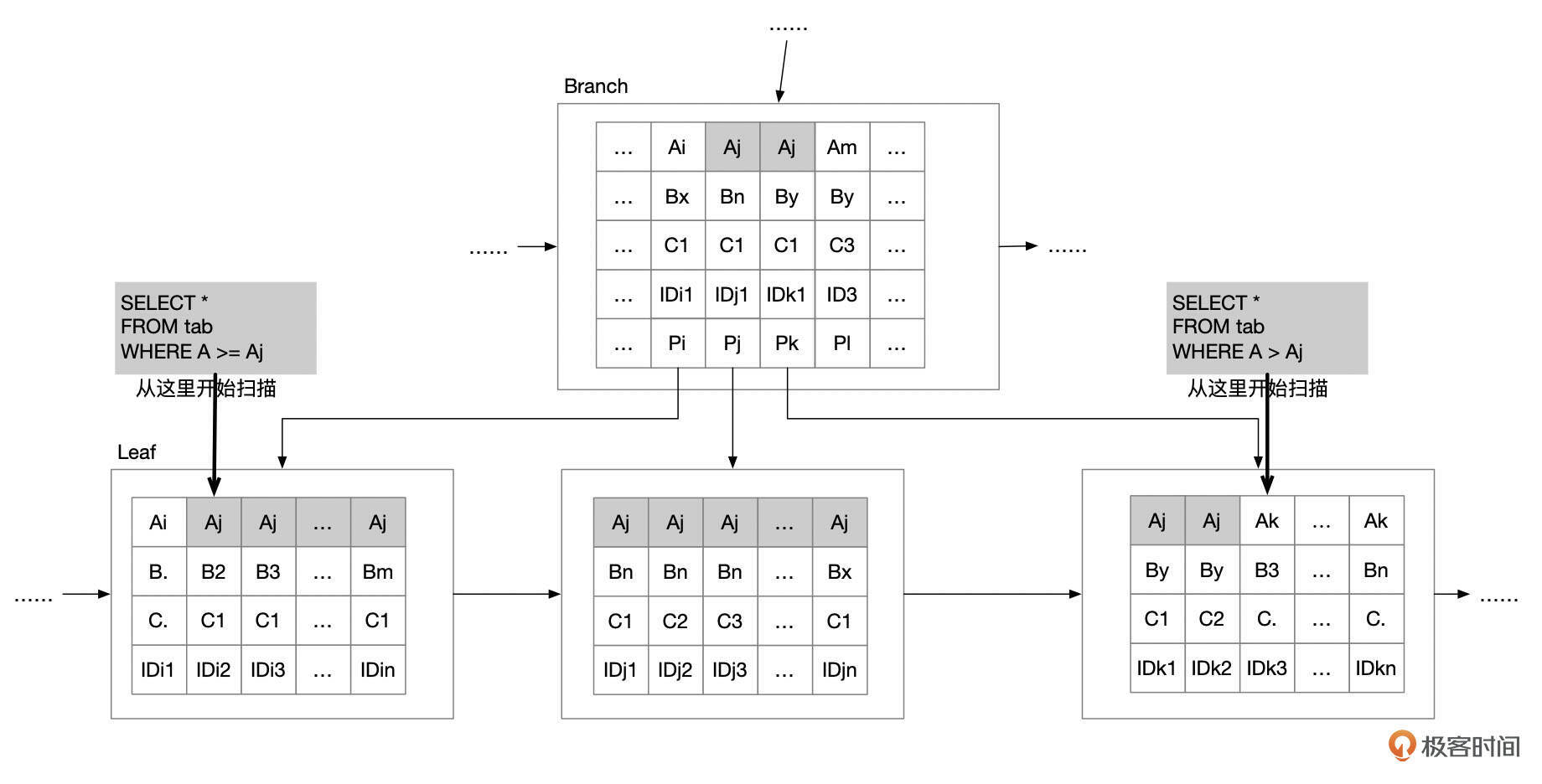 这2个语句都要根据边界值Aj来定位扫描的开始位置,语句1从记录 (Aj, B2, C1,I Di2) 开始扫描。语句2从记录 (Ak, B3, C, IDk3) 开始扫描。