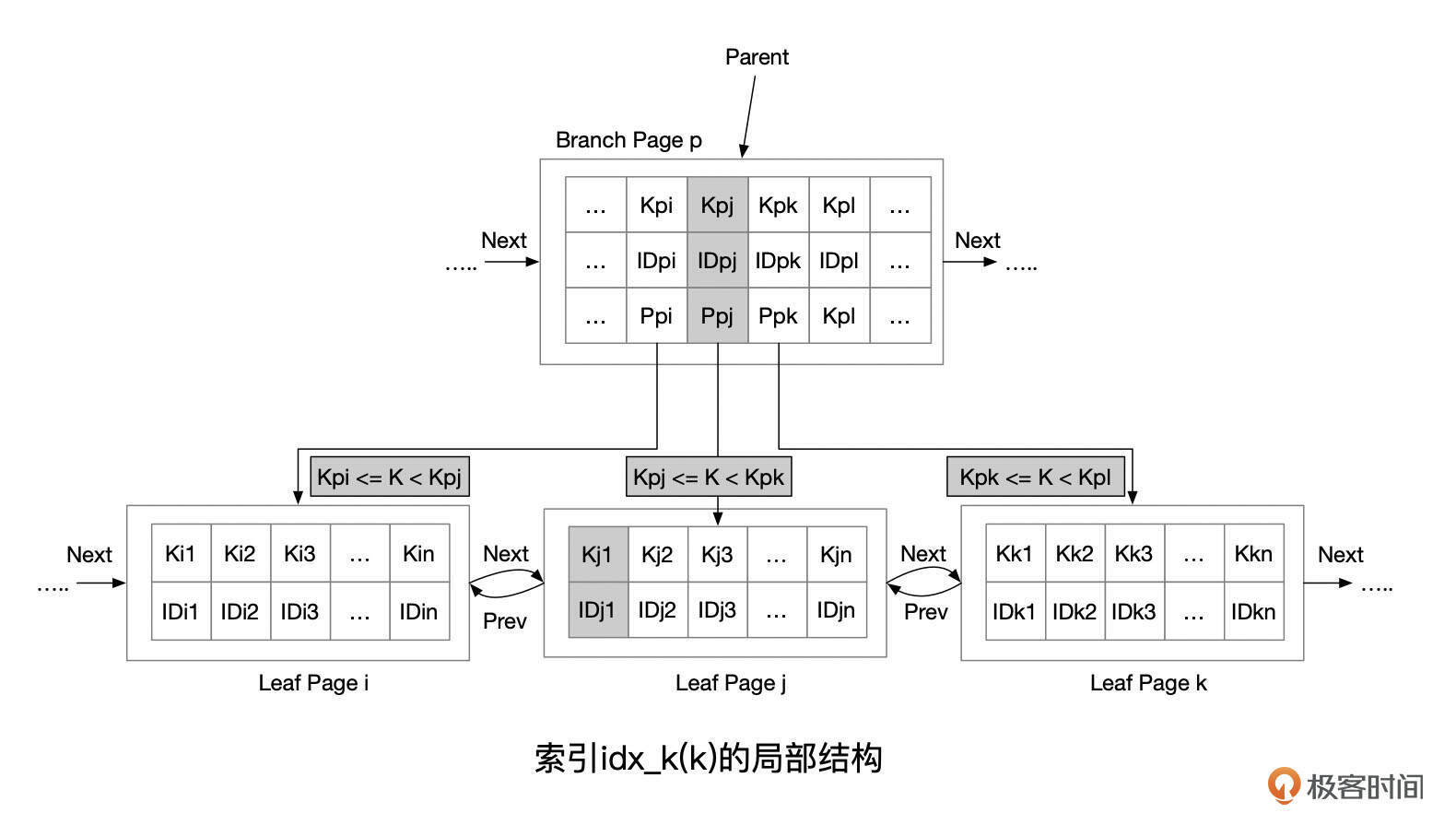 如果我们要查询的记录,K介于Kpj和Kpk之间,最终会定位到叶子页面Page j,使用二分查找法,就能找到这条记录,或者发现这条记录不存在。这里我们假设K的值没有重复。对K的值有重复的情况,可以参考接下来对组合索引的描述。