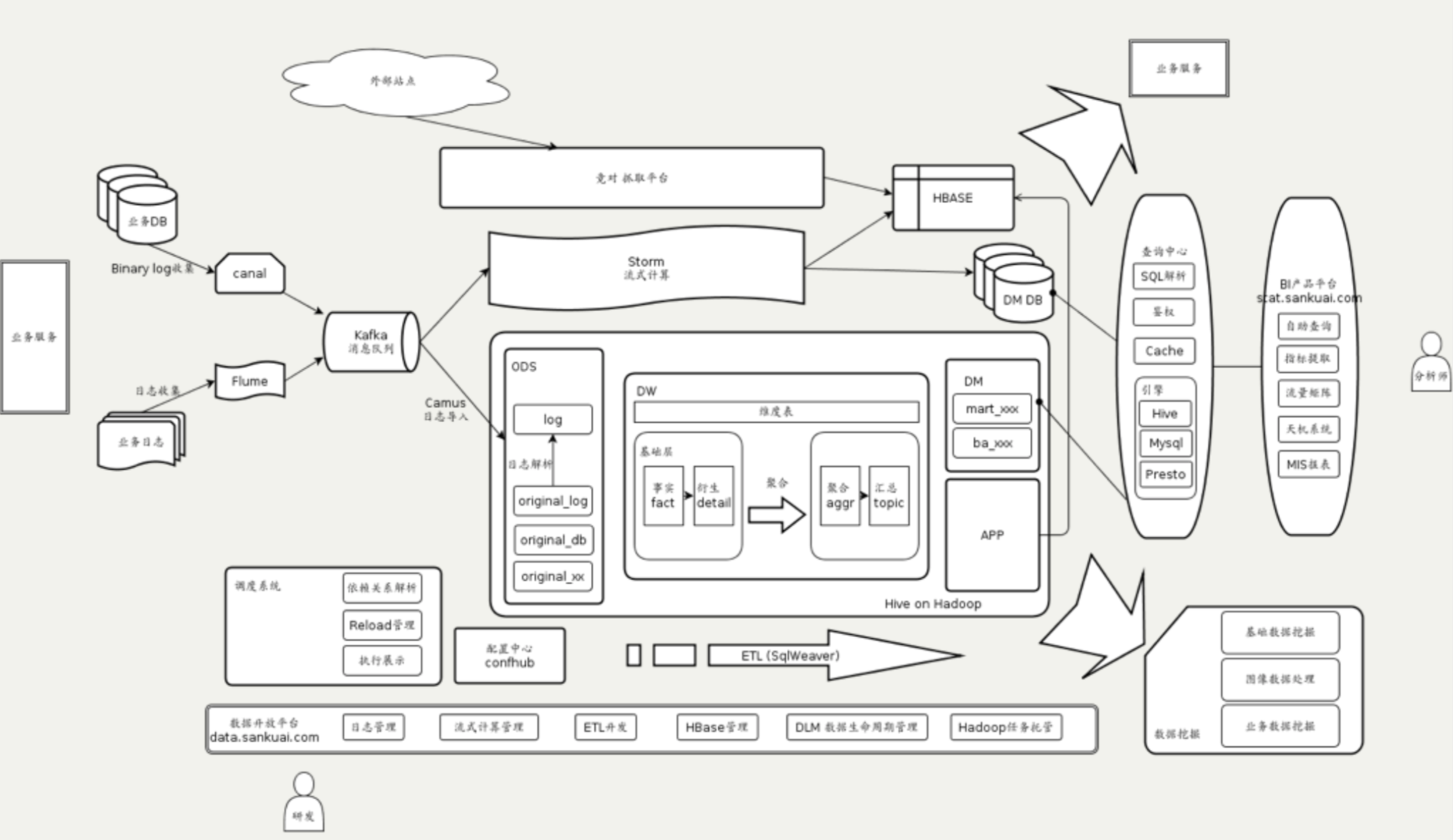 淘宝可能是中国互联网业界较早搭建了自己大数据平台的公司,下图是淘宝早期的Hadoop大数据平台,比较典型。