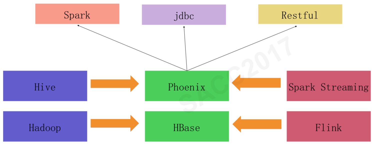 来自于实时计算平台和离线计算平台的计算结果被保存到HBase中,然后应用程序通过Phoenix访问HBase。而Phoenix是一个构建在HBase上的SQL引擎,可以通过SQL方式访问HBase上的数据。