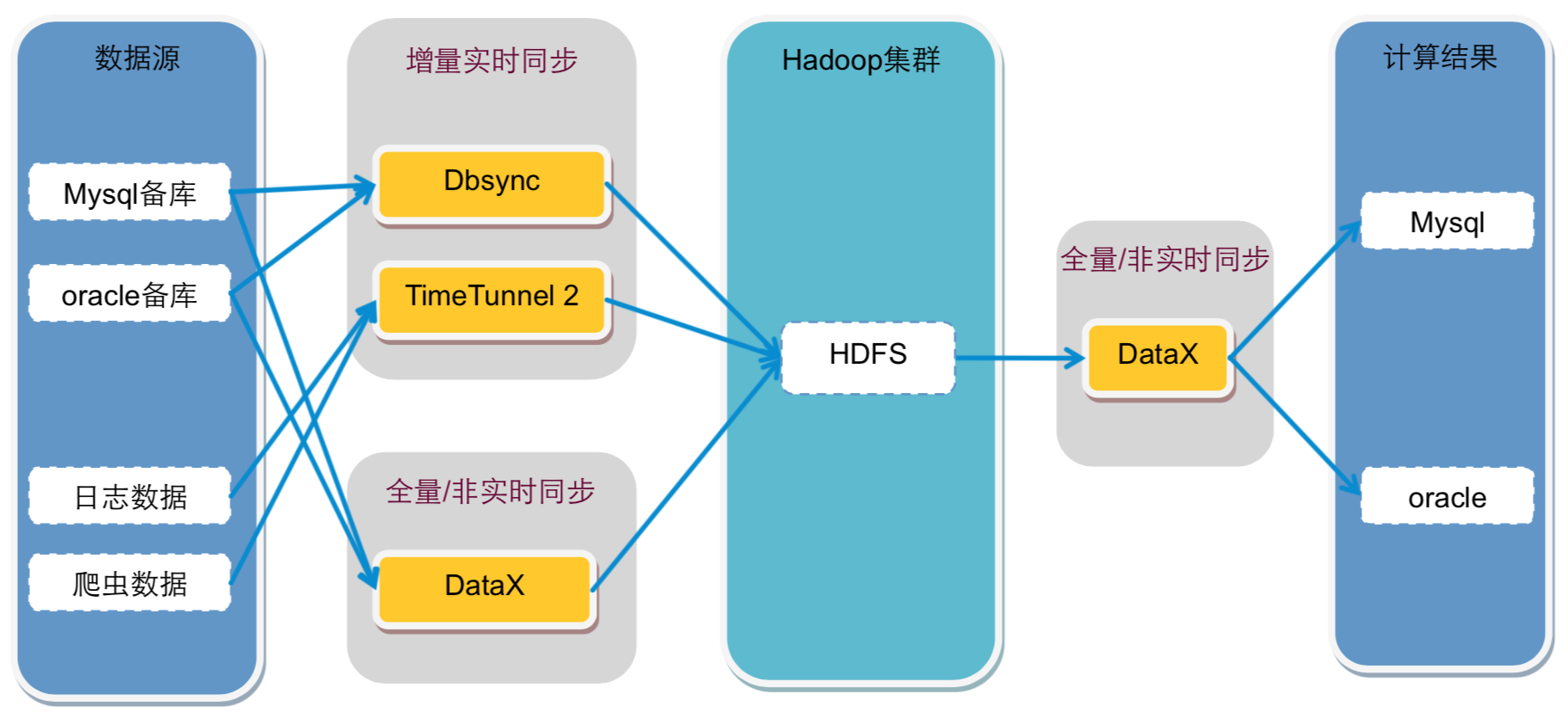 数据源主要来自Oracle和MySQL的备库,以及日志系统和爬虫系统,这些数据通过数据同步网关服务器导入到Hadoop集群中。其中DataExchange非实时全量同步数据库数据,DBSync实时同步数据库增量数据,TimeTunnel实时同步日志和爬虫数据。数据全部写入到HDFS中。