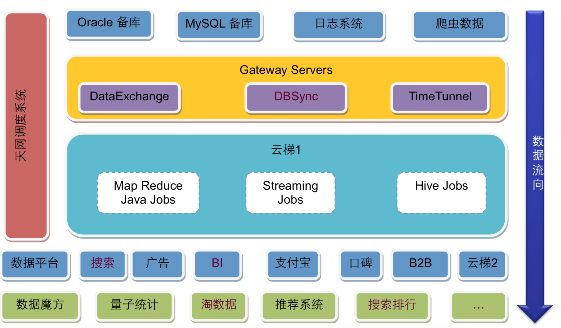 淘宝的大数据平台基本也是分成三个部分,上面是数据源与数据同步;中间是云梯1,也就是淘宝的Hadoop大数据集群;下面是大数据的应用,使用大数据集群的计算结果。