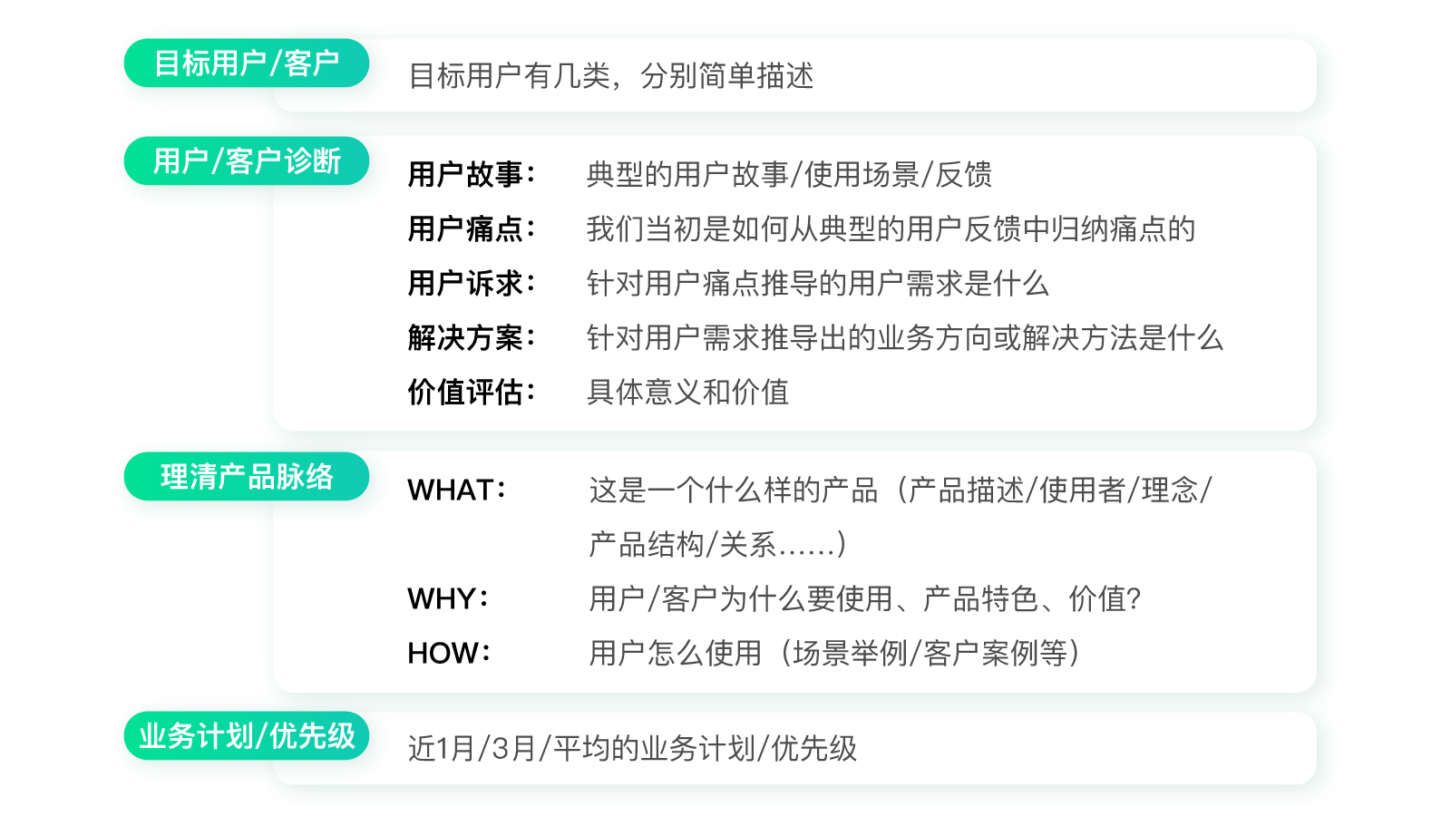 从这些问题中,我们就可以得知现有产品的来龙去脉,而不再是一头雾水的状态。这里需要特别说明的是价值评估和业务优先级。