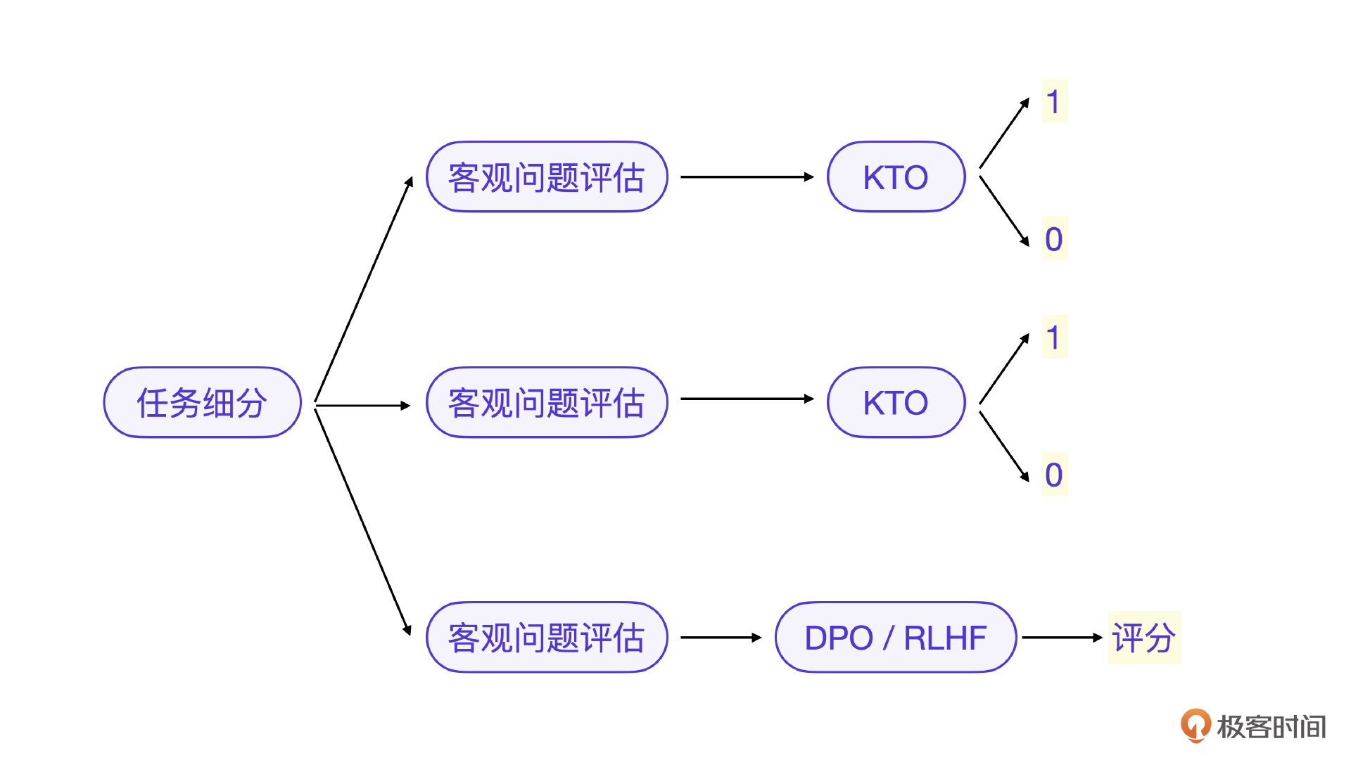 当然,具体项目里的大模型评估要根据实际需求来做评分算法,也不都是1和0这样的二值评分。比如我们要微调的大模型能力是对文章的分类,那大模型的输出是一个明确的值,可以用KTO类的输出判断方法,也就是输出符合预期/不符合预期。