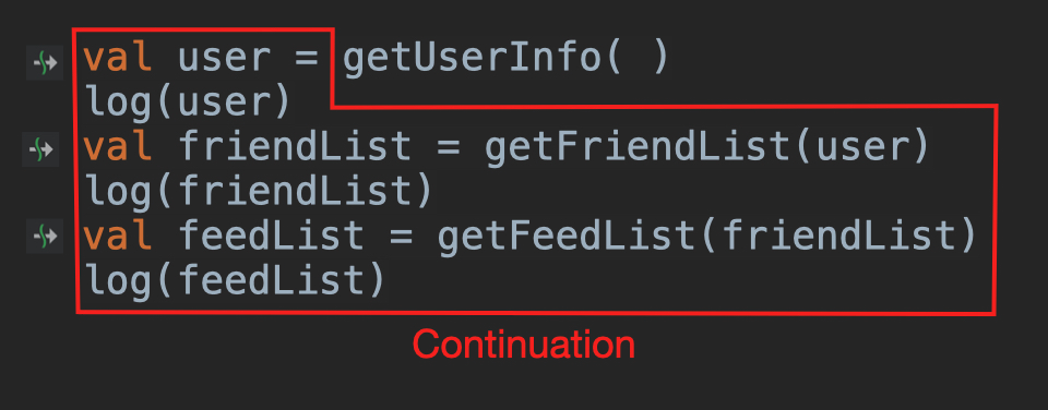 就以上面的代码为例,当程序运行getUserInfo()这个挂起函数的时候,它的“Continuation”则是下图红框的代码: