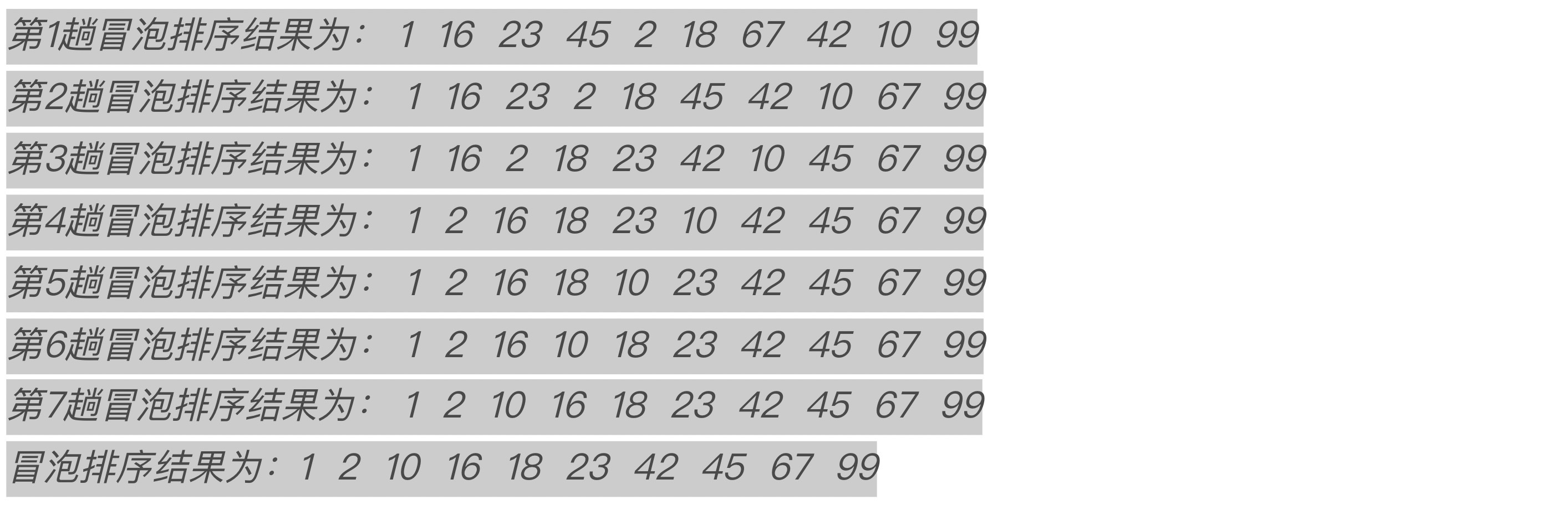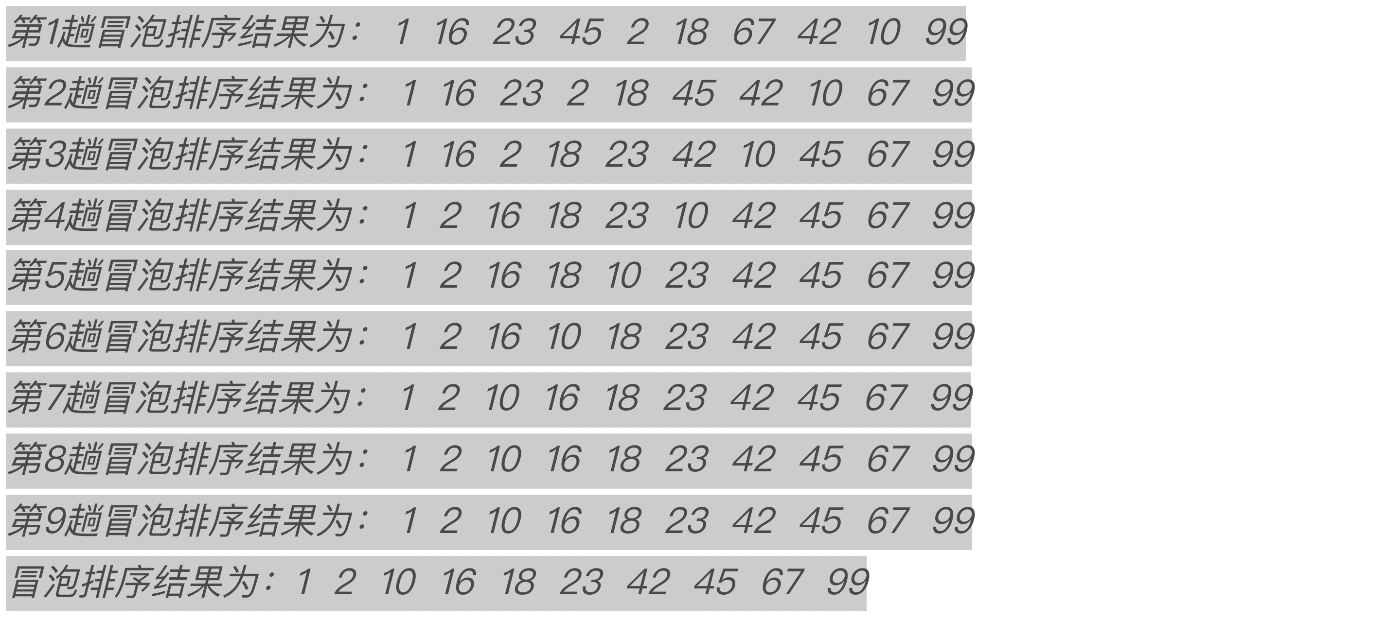 从结果可以看到,第7、8、9趟冒泡排序的结果相同,这意味着第8和第9趟排序是没有必要的,也就是这个算法可以提前结束。换句话说。冒泡排序的结束条件应该是“在一趟排序中没有进行过记录交换的操作”。