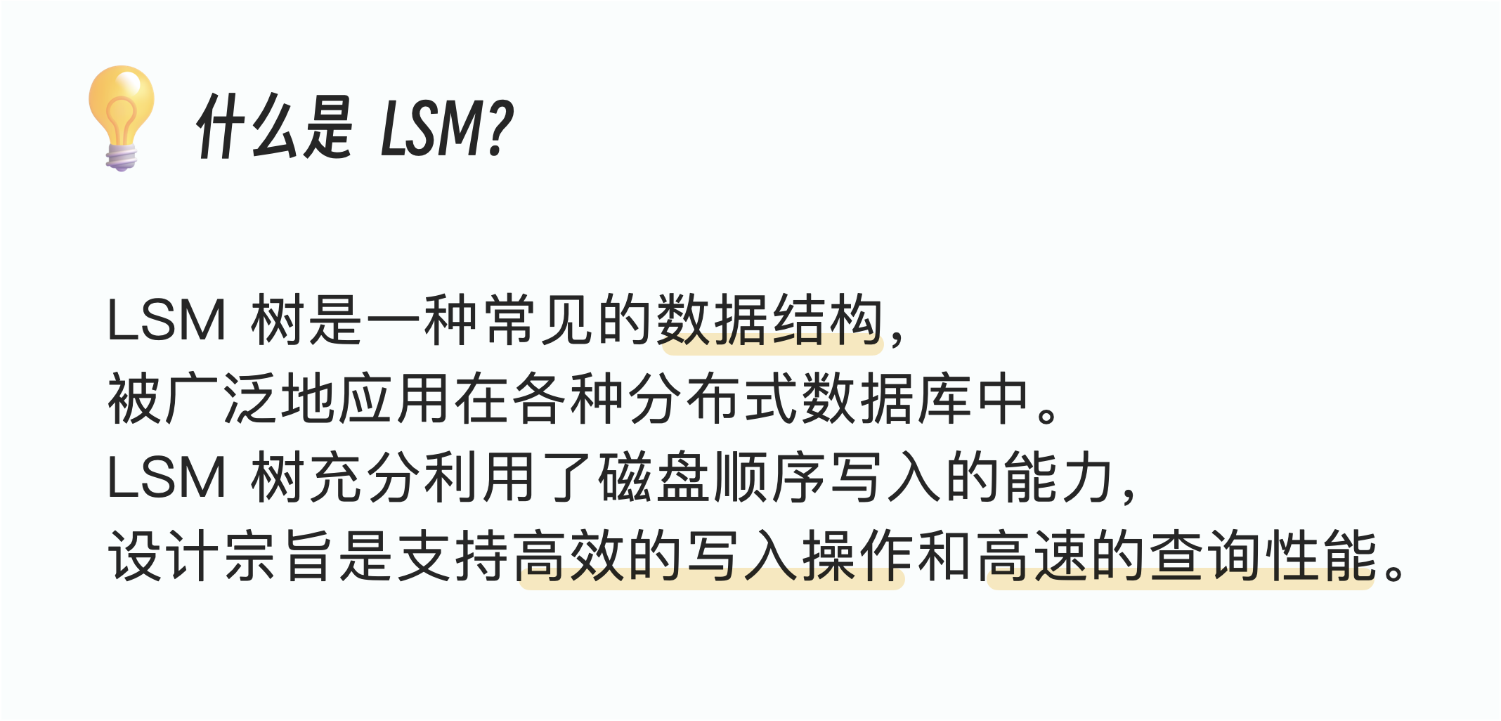 而我们今天要说的LSM(Log-Structured Merge-Tree,日志结构合并树),利用了MOR(Merge-On-Read)写入的优点,同时又通过Compact来避免了MOR读取时需要读取多个文件的缺点,被很多存储引擎用来提升写入性能。