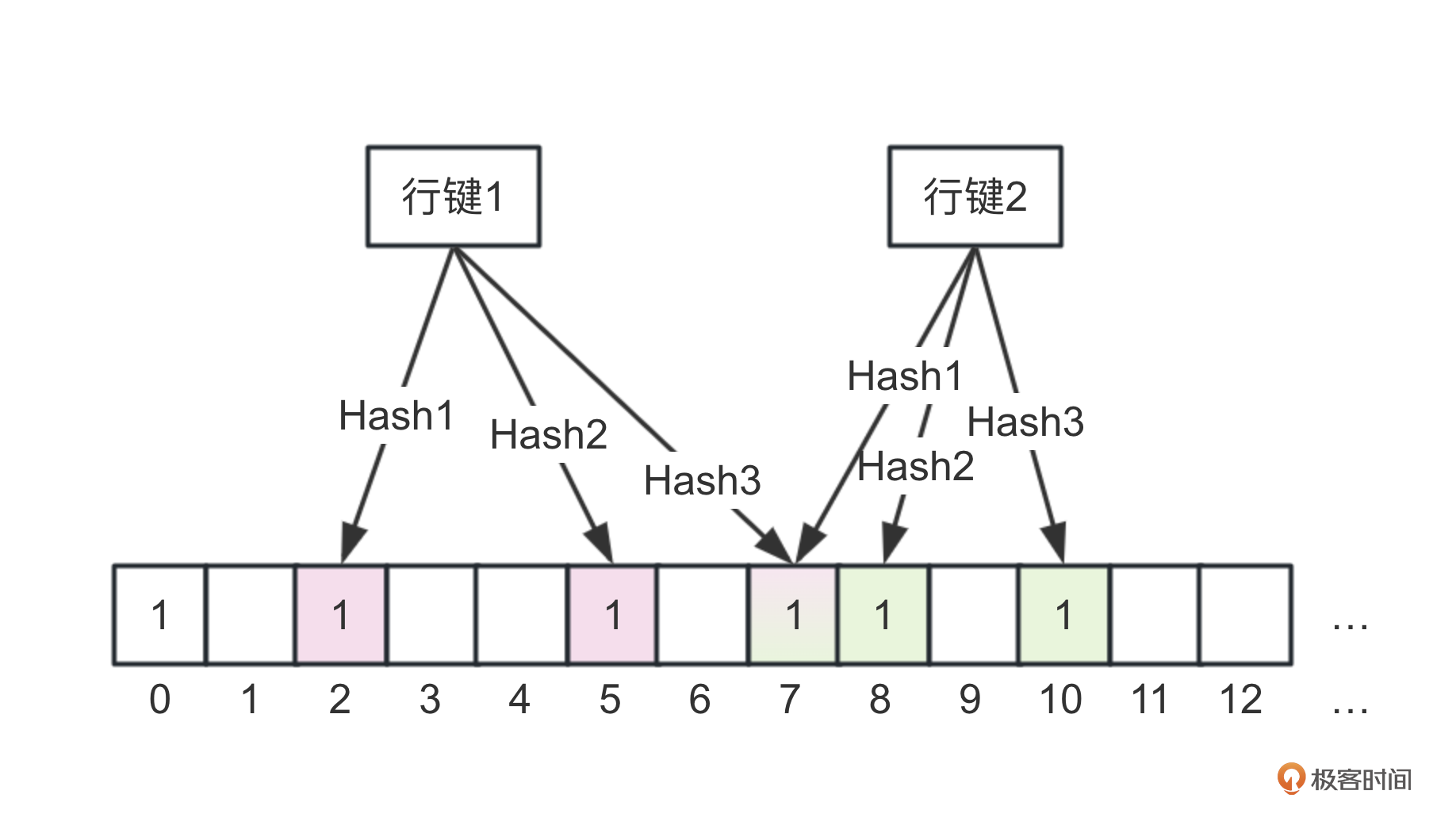 数据写入的时候,用数据的行键,这里是“行键1”进行了一系列的hash计算,比如图中进行了Hash1、Hash2、Hash3总计3个函数计算,将每个hash函数计算结果映射到了位图的一个bit位或者说hash桶。这里我让“行键1”映射到了下标为2、5、7的3个bit位。