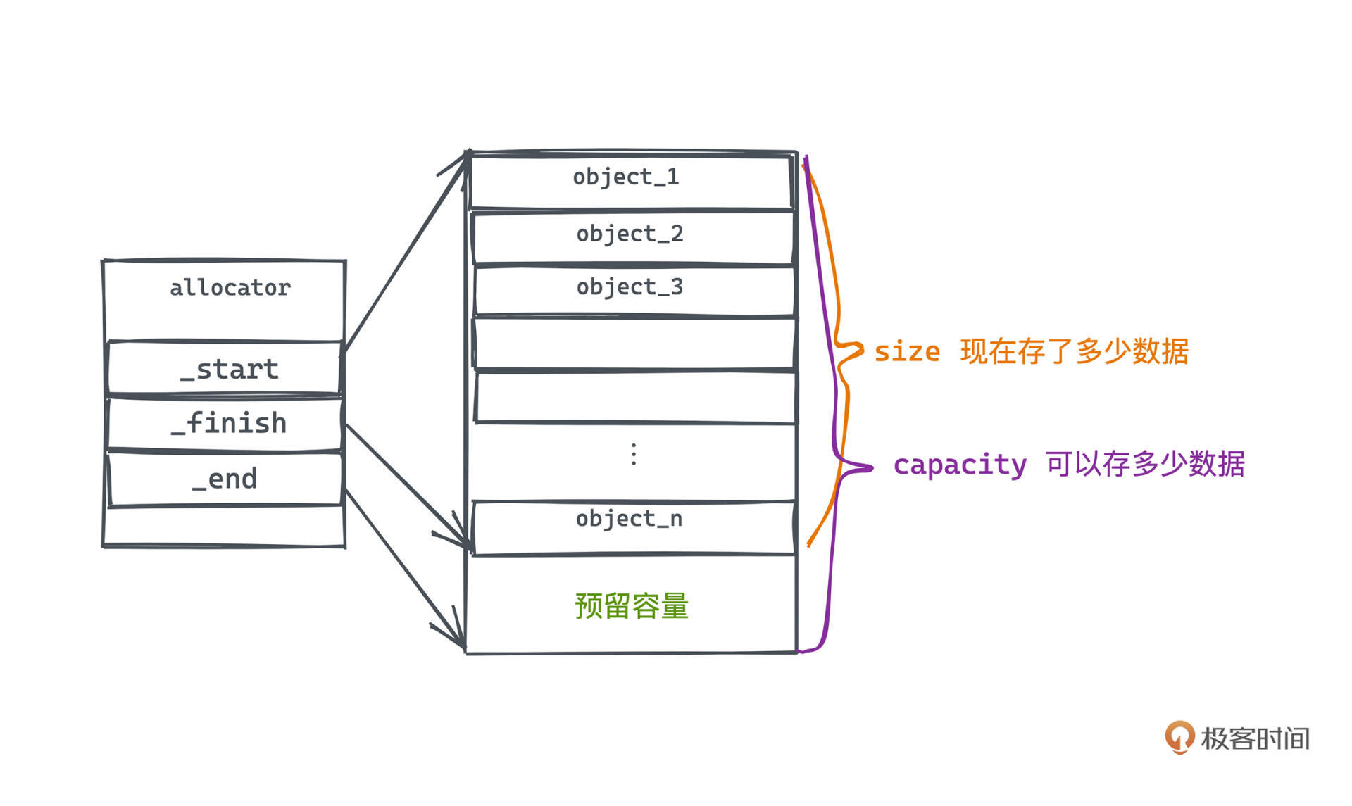 所以为了减少二次分配的次数,初次配置空间的时候,可以分配比vector目前所需空间更多一些,后续的若干次插入就不再需要触发昂贵的扩容操作了。这样的可用空间,我们称为vector的容量,是vector在创建时需要的第二个可选参数。